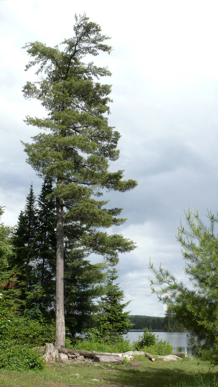 Landing Topography of under-water approach: At the east side of the campsite's point, an area of smooth granite provides an opportunity to step out of a canoe one at a time. Impediments to disembarking from and/or unloading a canoe: Once the canoe is held tight to the rock landing, gear can be unloaded on to the same rock area relatively easily. Topography to tent sites: The majority of the campsite is level with its landing area. A large bit of bedrock on the east side of the point provides a good landing and unloading area ... Looking across the east half of the campsite, with firepit to the left and landing area to the right ... Campsite Campsite maintenance: regular Size of open area: Large open area is exposed to the weather. Extent of tree cover: Forest edge to the north provides a couple of small semi-sheltered areas. Degree of levelness: Mostly quite level. Somewhat irregular into the rear wooded area. Number of level tent sites: Easily nine freestanding solo tent sites, or less larger ones. North exposure: Totally blocked from the north wind by the forest. East exposure: Quite open to the east wind. South exposure: Quite open to the south wind. West exposure: Quite open to the west wind and sunset view. A large grass area provides sites for freestanding tents ... The southwest view .. toward the channel from Fawn Lake ... The west view .. toward an island and the channel to Tom Thomson Lake ... General description: This campsite is a grassy point, exposed to the sun and wind on three sides. In good weather, its a wonderful site. However, in windy and/or wet conditions it offers little protection or opportunities to string up tarps. Overall accessibility: As long as one is sure-footed when coming ashore to the rock landing, the site is quite accessible. This campsite could serve as an OK one-night stopover as long as bad weather wasn't expected. However, its lack of protection from the elements is a serious drawback. Note: In February of 2020, Wanda Spruyt submitted a PCI report of this campsite, clearly showing some changed conditions between June of 2008 and September of 2019. The trees along the shore have undergone some serious growth. In so doing, they cast more shade upon the point's shoreline and open area. The open area was lush with green springtime grass in the earlier visit. After 11 years of continued use, more shade and summertime dryness .. the open area definitely appears "less green". Over those same 11 years, the inland trees have developed a denser canopy, which along with continued use has shaded the forest floor and helped in reducing ground-level growth. Following are Wanda's photos of conditions existing in September of 2019, plus a photo from a 1994 canoe trip when much of the point was covered in small pines and deciduous bushes. Collectively. this report's photos illustrate the pronounced changes in vegetation possible over a quarter century! 2019 view of the campsite from off-shore. All the trees are now much fuller! ... 2019 - Shoreline pines have grown and lost their ground-level branches, revealing a sandy beach landing ... 2019 - More shade from the shoreline pines has reduced a once grassy area ... 2019 - Inland trees have developed a denser canopy and a more open under-story ... 1994 - The SW view a quarter century ago, much of the point was covered in small pines, bushes and grass ...