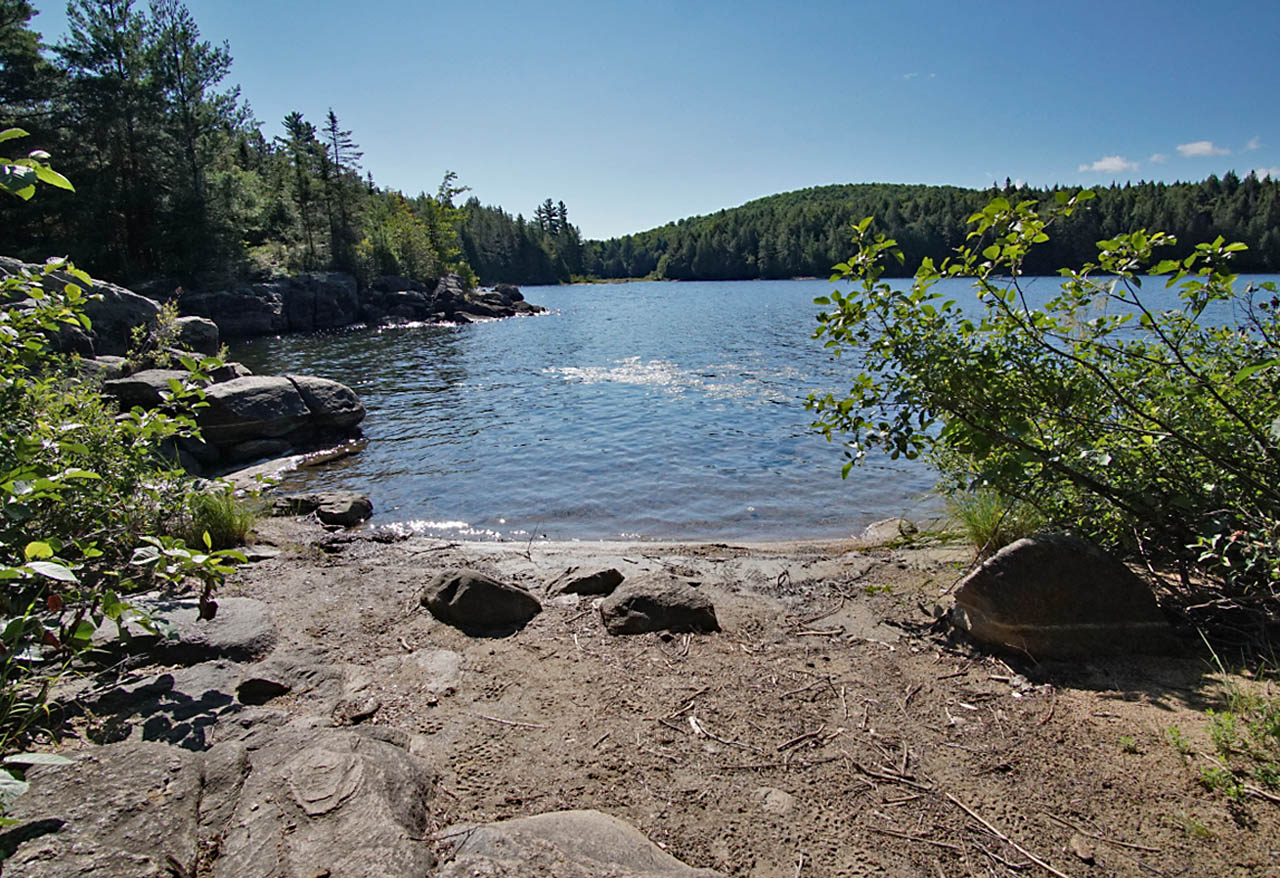 Landing Topography of under-water approach: Shallow, sandy with a few small rocks. The water surrounding the campsite is shallow with some larger rocks and fallen trees which can make the approach a little tricky. Impediments to disembarking from and/or unloading a canoe: There are a few smaller rocks in the landing area, but they did not really present any difficulty. Topography to tent sites: The access to the campsite is easy with a short walk up from the water and only a gentle slope.