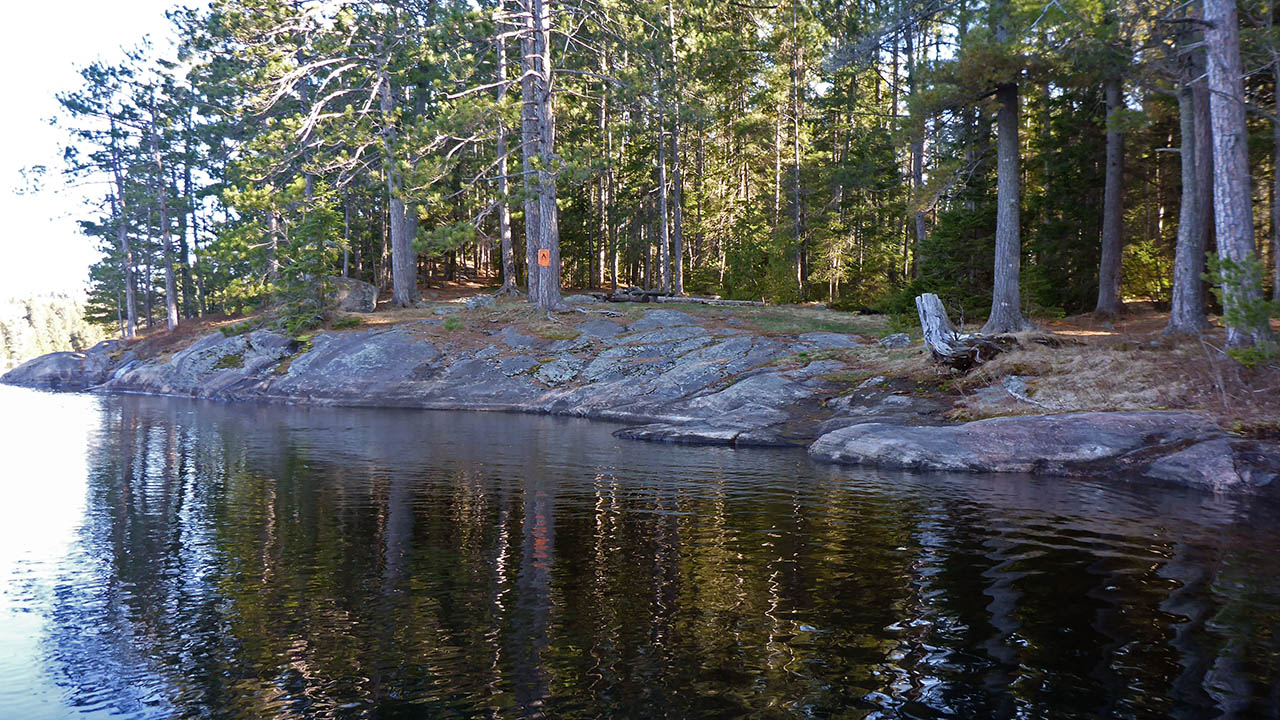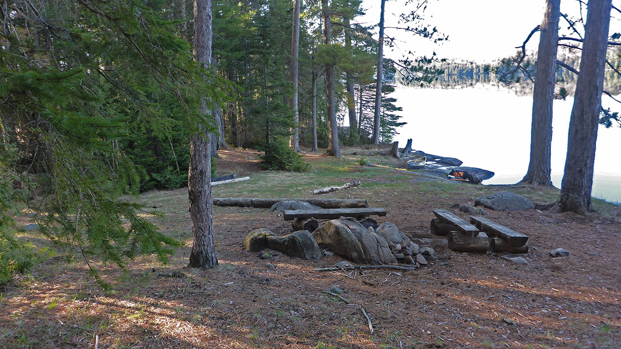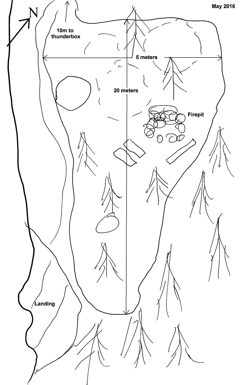 Landing Topography of under-water approach: Large slab of rock serves as the landing. Impediments to disembarking from and/or unloading a canoe: None. Topography to tent sites: A 10m carry to the firepit, with an elevation change of 2m on smooth ground. Campsite Campsite maintenance: Regular. Size of open area: 20m x 5m. Extent of tree cover: 20%. Degree of levelness: : An elevation change of 2m from the back of the site to the landing. Number of level tent sites: Tentpad to west of firepit could handle 2 tents. There is a smaller area north of the firepit that could be used as well, and just south and adjacent to the firepit, should it be necessary. North exposure: Trees. East exposure: Trees. South exposure: Water. West exposure: Water. General description: A fairly large, open site, with a great view of the water. Is located in the northwestern bay so there is no view of the main part of the lake. Even thou it is a somewhat large site, there are limited tenting options. Overall accessibility: Once out of the canoe, it is an easy climb to the firepit. Firepit and tentpad west of firepit ... Tentpad to north of firepit ... Looking from western tentpad at firepit and possible tentpad adjacent to the firepit... ![]() Thanks to Jeffrey McMurtrie of Jeff'sMap for supplying the base-layer map component by Creative Commons licensing. Submitted by Chris Taylor .. Visited July 2016 .. Submission August, 2016 |