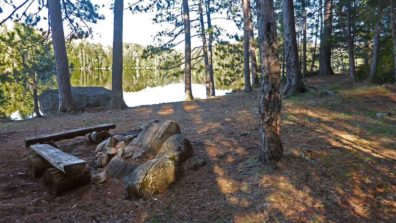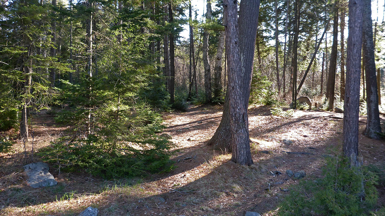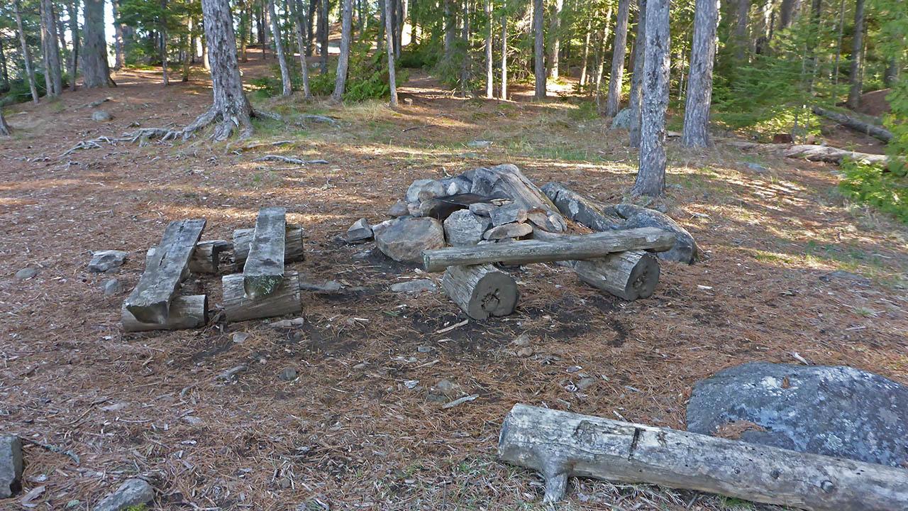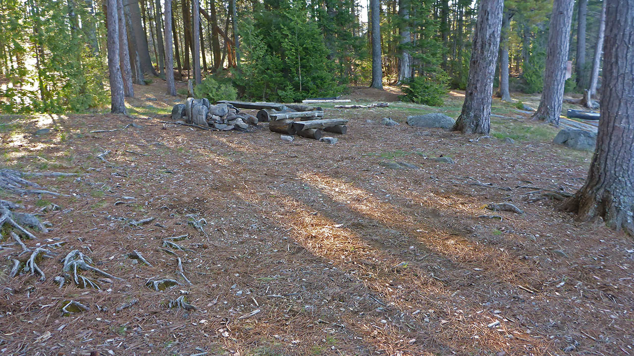 Landing Topography of under-water approach: Large slab of rock serves as the landing. Impediments to disembarking from and/or unloading a canoe: None. Topography to tent sites: A 10m carry to the firepit, with an elevation change of 2m on smooth ground. Campsite Campsite maintenance: Regular. Size of open area: 20m x 5m. Extent of tree cover: 20%. Degree of levelness: : An elevation change of 2m from the back of the site to the landing. Number of level tent sites: Tentpad to west of firepit could handle 2 tents. There is a smaller area north of the firepit that could be used as well, and just south and adjacent to the firepit, should it be necessary. North exposure: Trees. East exposure: Trees. South exposure: Water. West exposure: Water. General description: A fairly large, open site, with a great view of the water. Is located in the northwestern bay so there is no view of the main part of the lake. Even thou it is a somewhat large site, there are limited tenting options. Overall accessibility: Once out of the canoe, it is an easy climb to the firepit. Firepit and tentpad west of firepit ... Tentpad to north of firepit ... Looking from western tentpad at firepit and possible tentpad adjacent to the firepit... ![]() Thanks to Jeffrey McMurtrie of Jeff'sMap for supplying the base-layer map component by Creative Commons licensing. Submitted by Chris Taylor .. Visited July 2016 .. Submission August, 2016 |