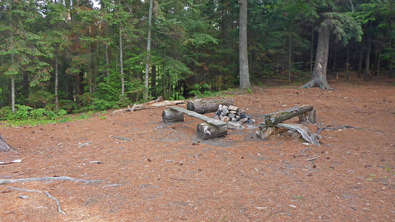 Landing Topography of under-water approach: Shallow water with a gravel bottom. Impediments to disembarking from and/or unloading a canoe: None. Topography leading to tent sites: 5 meter elevation, staircase. Campsite Regular or low-maintenance: Regular Size of open ground area: 10 x 15 meters. Extent of tree cover: 40%. Degree of levelness: Level. Number of tent sites: 4+. North exposure: Trees, partial view of lake. East exposure: View of the lake. South exposure: Trees, partial view of lake. West exposure: Trees. General description: A large, open site with plenty of tenting options. A good view of the lake, but little protection from all but a wind from the west as the site is on a point, and is elevated 5m. The majority of the site is uncovered, with most of the trees coverage occurring at the perimeter of the site. There is a path at the southwest corner of site that leads to a 200m long sandy beach on the southern shore of this point. Overall accessibility: Without the staircase, this would be a difficult site to access.. View of front of site from south tentpad ... Looking at back of site from south tentpad ... ![]() Thanks to Jeffrey McMurtrie of Jeff'sMap for the base-layer map component by Creative Commons licensing. Submitted by: Chris Taylor .. Visited July, 2018 .. Submission November, 2018 |