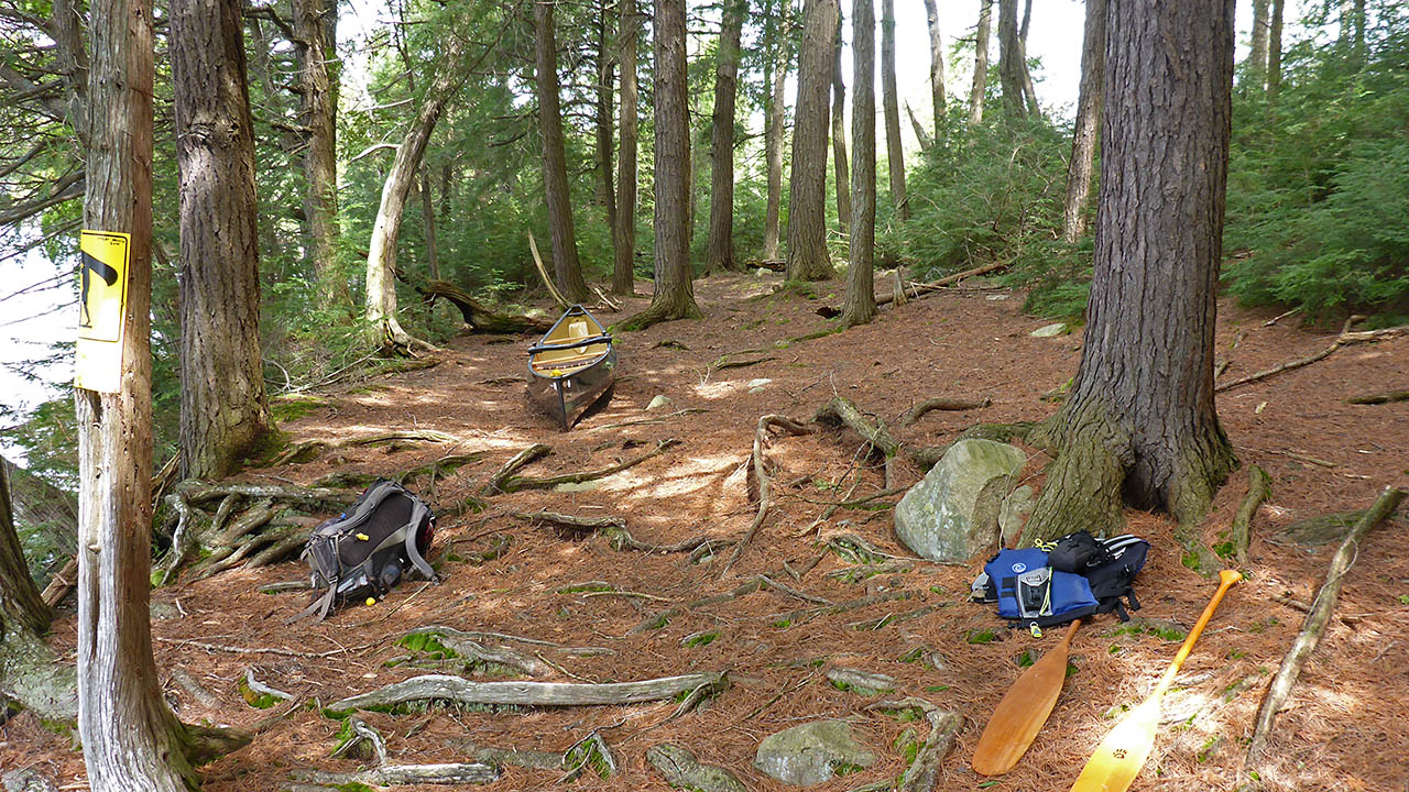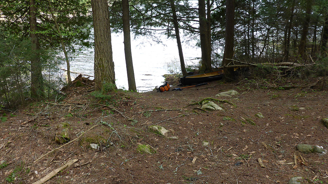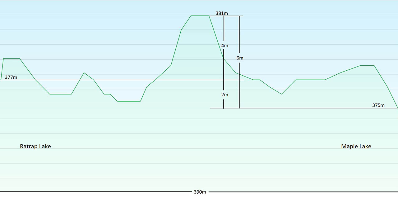 Length of portage: 390 meters. Portage maintenance regular or low: Regular. Elevation above Sea Level @ Ratrap Lake is 377 meters. Elevation above Sea Level @ Maple Lake is 375 meters. Difference in elevation: 2 meters (approx.). Elevation of highest point: 381 meters. Overall rise/fall: 6 meters. (Above data is extracted from 'Jeff's Map'.) Landing at Ratrap Lake (elevation 377m) Topography of under-water approach: Rock at shoreline, must step directly to shore because of the steep drop-off. Impediments to disembarking from and/or unloading a canoe: None, room for one canoe at a time. Landing at Ratrap Lake ...![]() ![]() ![]() Portage Trail Cross-section profile ...![]() Landing at Maple Lake (elevation 375m) Topography of under-water approach: Mud, sand, and silt underwater that has a moderate drop-off. Impediments to disembarking from and/or unloading a canoe: None. Topography of the ascending grade: A wide, smooth path. Impediments to moving gear to portage trail: None, has lots of room for gear staging. Landing at Maple Lake ...![]() ![]() ![]() ![]() Thanks to Jeffrey McMurtrie of Jeff'sMap for supplying the base-layer map component by Creative Commons licensing. Submitted by Chris Taylor, visited May 2015, submitted December 2019 |