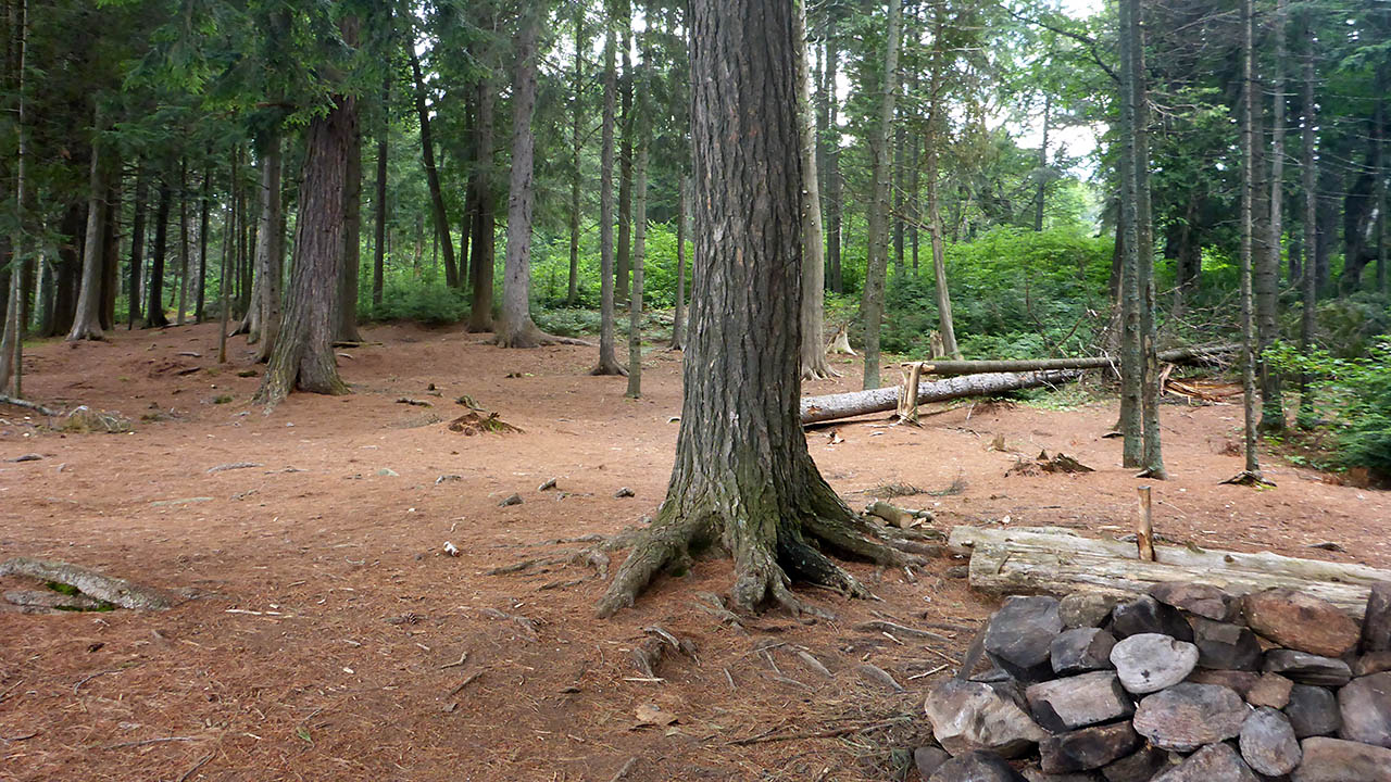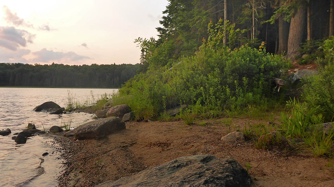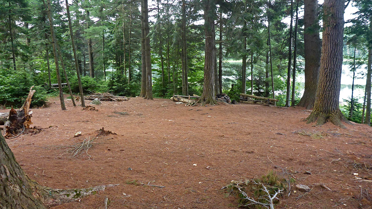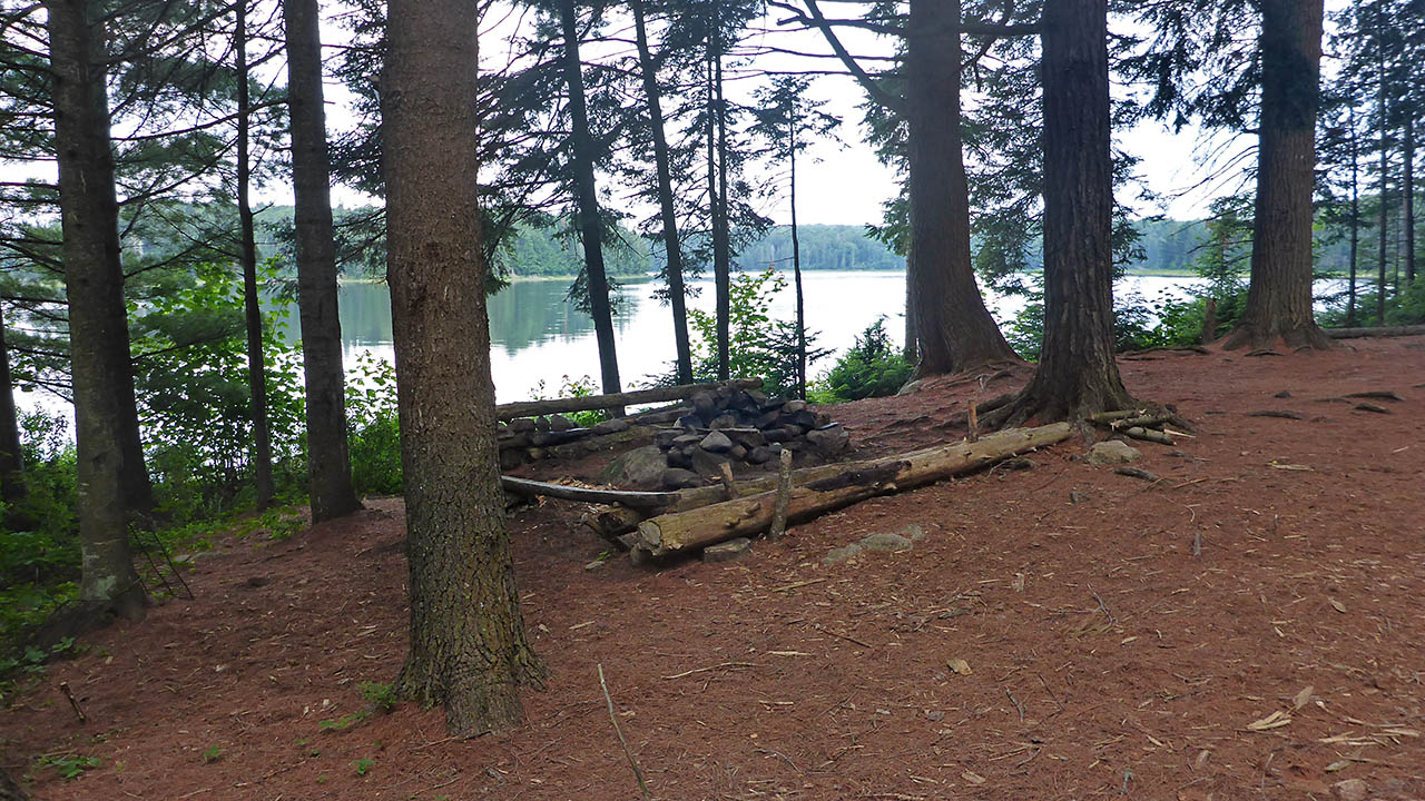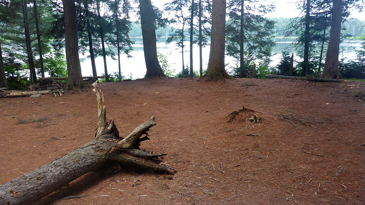 Campsite Campsite maintenance: Regular. Size of open area: 20m x 15m. Extent of tree cover: 75%. Degree of levelness: Level with uneven spots at the perimeter. Number of level tent sites: 5+. North exposure: Trees. East exposure: Trees. South exposure: Trees and view of lake. West exposure: View of lake. General description: A large site that can easily accommodate 5 tents. The center of the site is fairly flat and level, while there are a couple of other spots that a tent could be pitched on. A nice firepit with a good view of the lake for sunset viewing. Overall accessibility: No issues in landing and unloading of canoe, and the path should pose no problems.