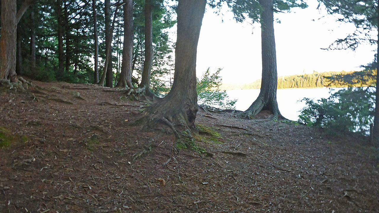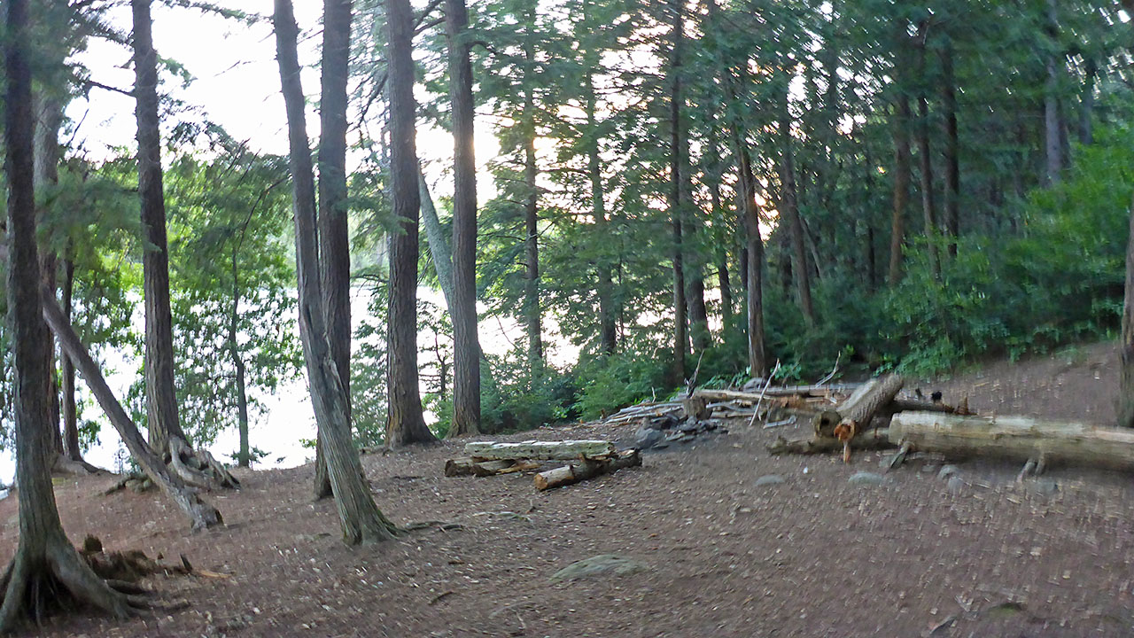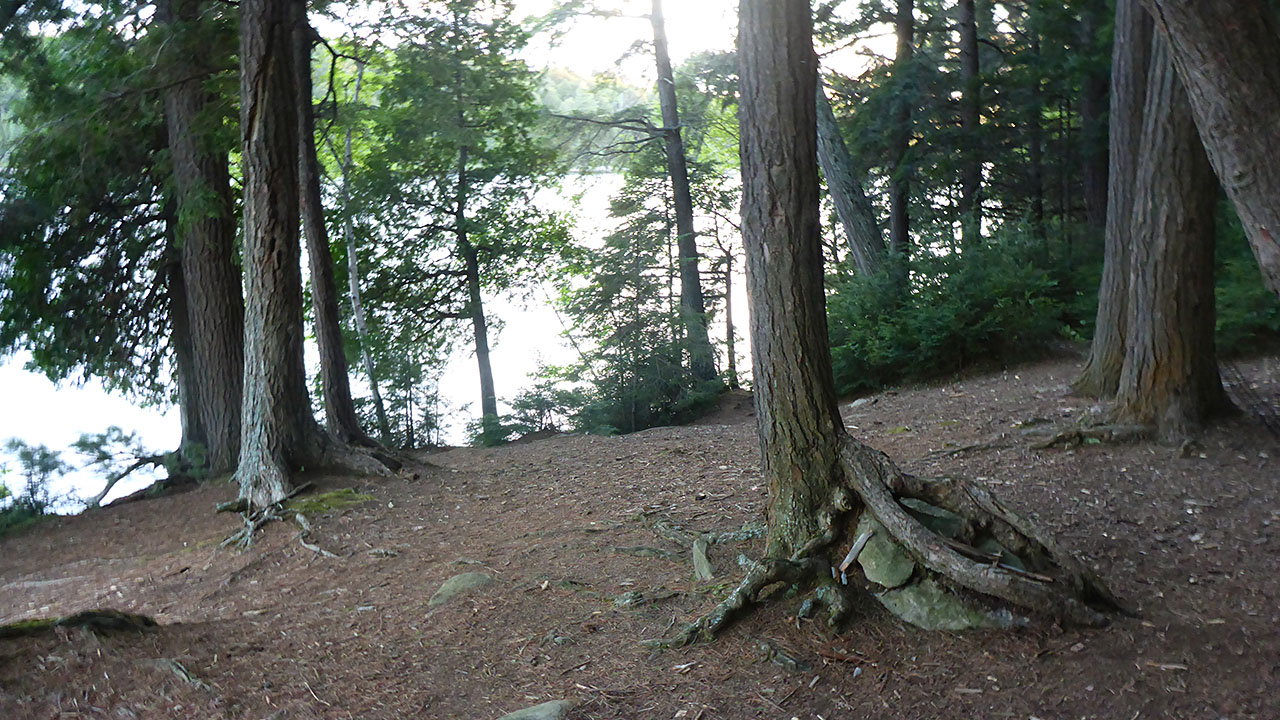 Campsite Regular or low-maintenance: Regular Size of open ground area: 20m x 15m. Extent of tree cover: 90%. Degree of levelness: Not level. Number of tent sites: 1 x 3 man. North exposure: Limited view of lake. East exposure: Trees. South exposure: Trees. West exposure: Limited view of lake. General description: A large site with a significant slope from back to front. Not much of the site is usable for tenting. The area below the firepit (northeast) could be used in a pinch, but would still not allow a level sleep. Very treed, but a nice view of the lake from the ledge that fronts the site. Overall accessibility: : Unloading a canoe is no problem. There is steep step up to a narrow, side sloped path that leads up to the site, that could be slippery when wet.