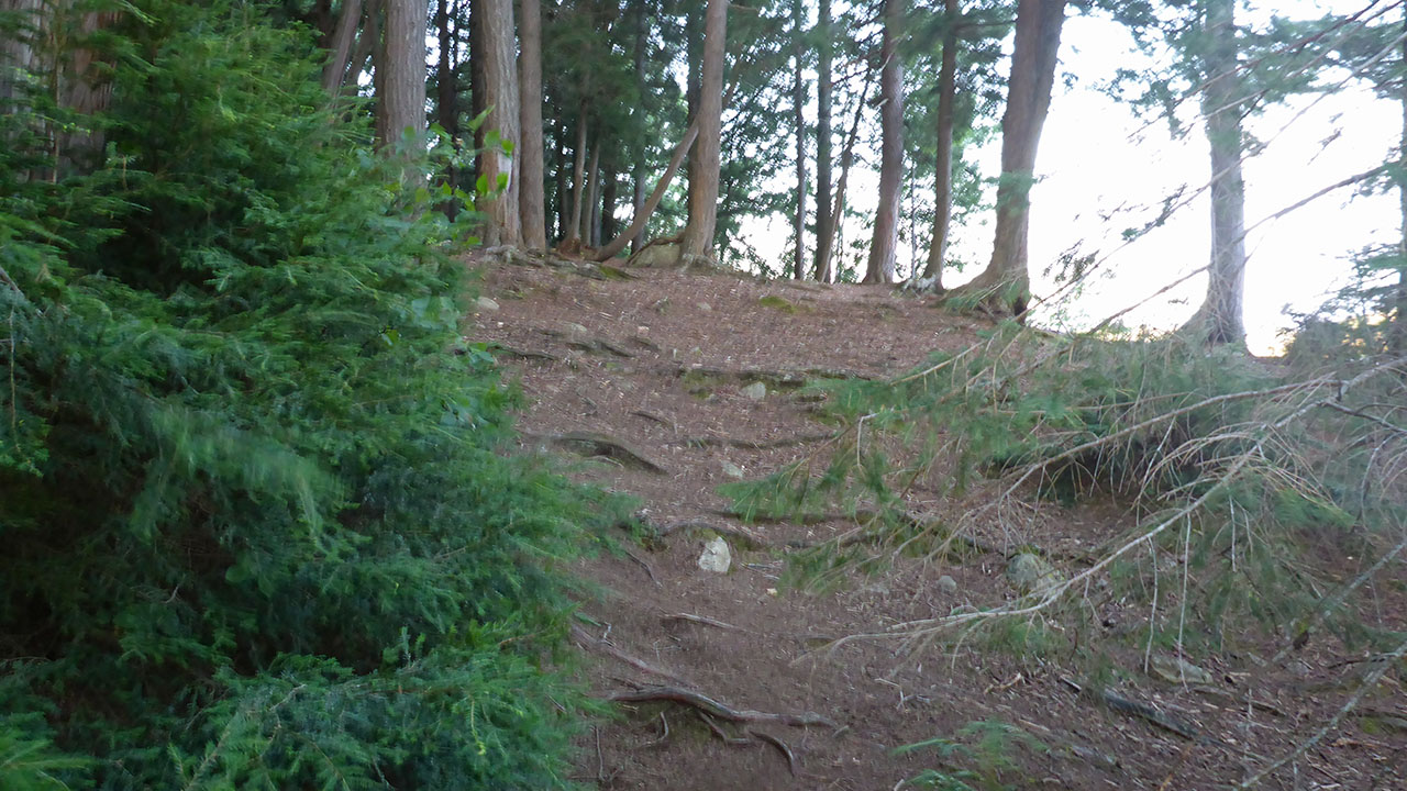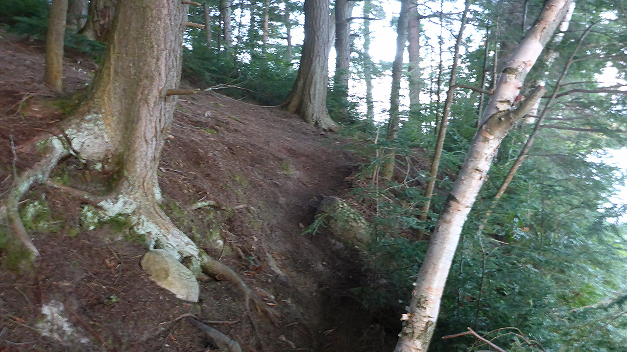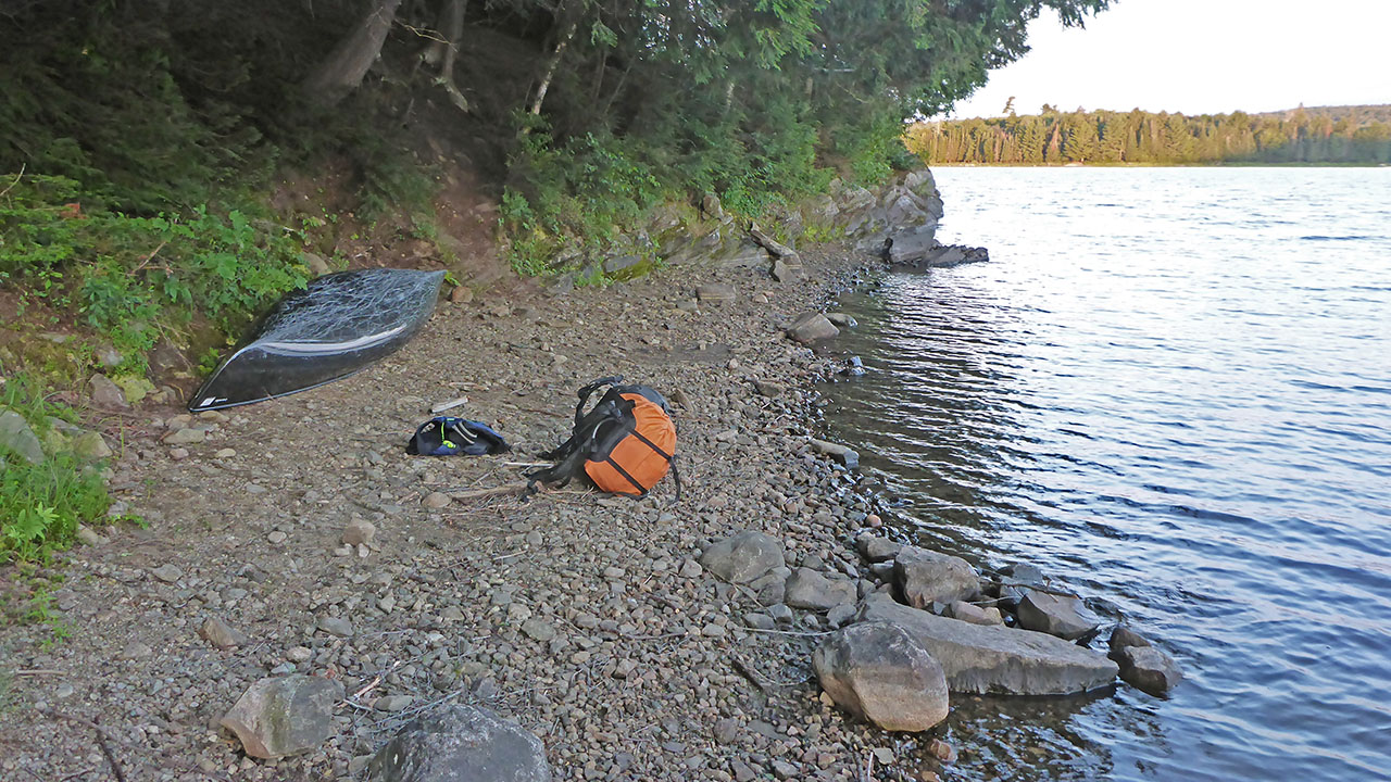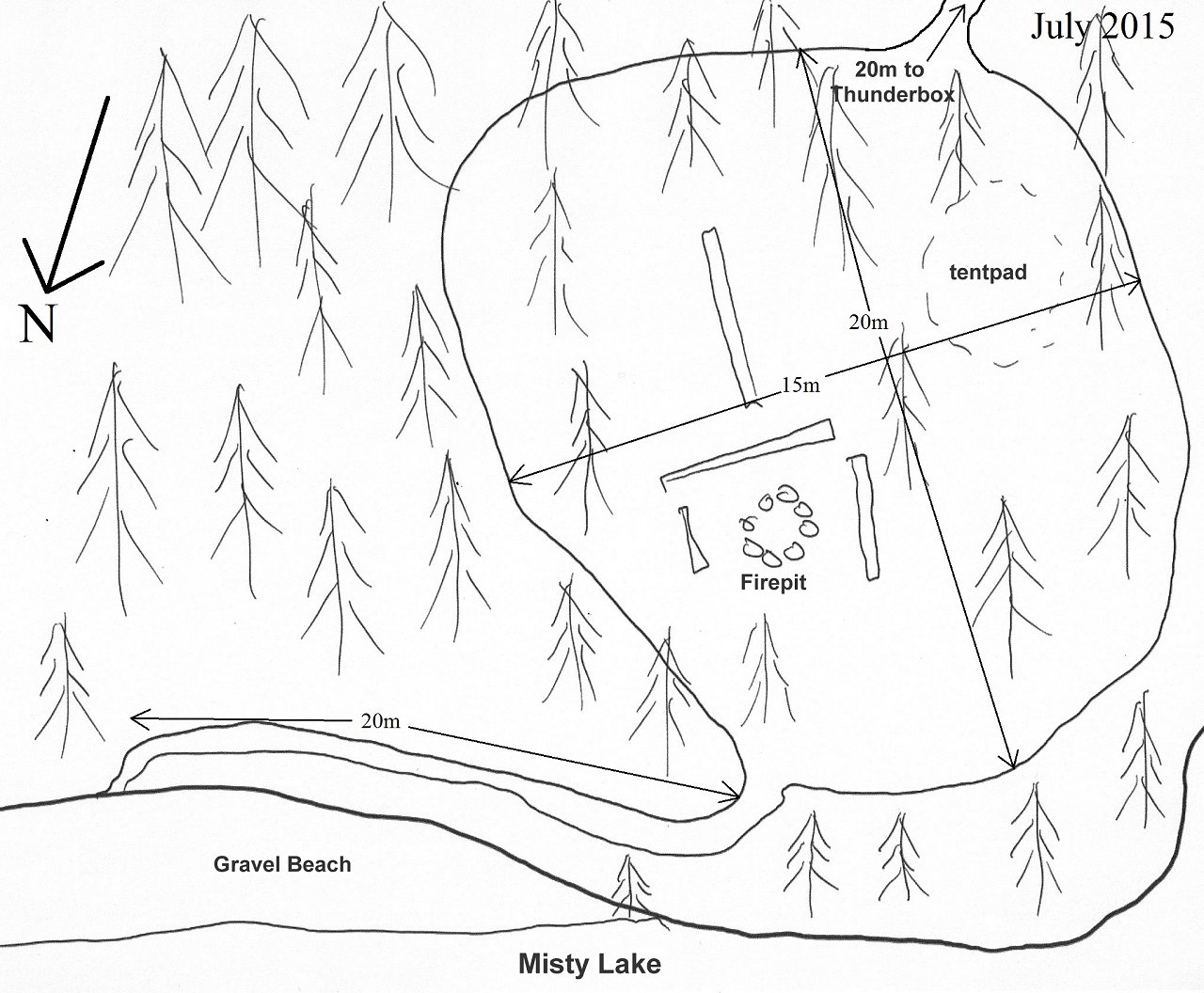 Campsite Regular or low-maintenance: Regular Size of open ground area: 20m x 15m. Extent of tree cover: 90%. Degree of levelness: Not level. Number of tent sites: 1 x 3 man. North exposure: Limited view of lake. East exposure: Trees. South exposure: Trees. West exposure: Limited view of lake. General description: A large site with a significant slope from back to front. Not much of the site is usable for tenting. The area below the firepit (northeast) could be used in a pinch, but would still not allow a level sleep. Very treed, but a nice view of the lake from the ledge that fronts the site. Overall accessibility: : Unloading a canoe is no problem. There is steep step up to a narrow, side sloped path that leads up to the site, that could be slippery when wet.