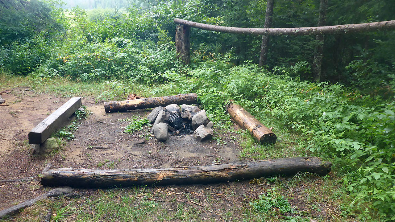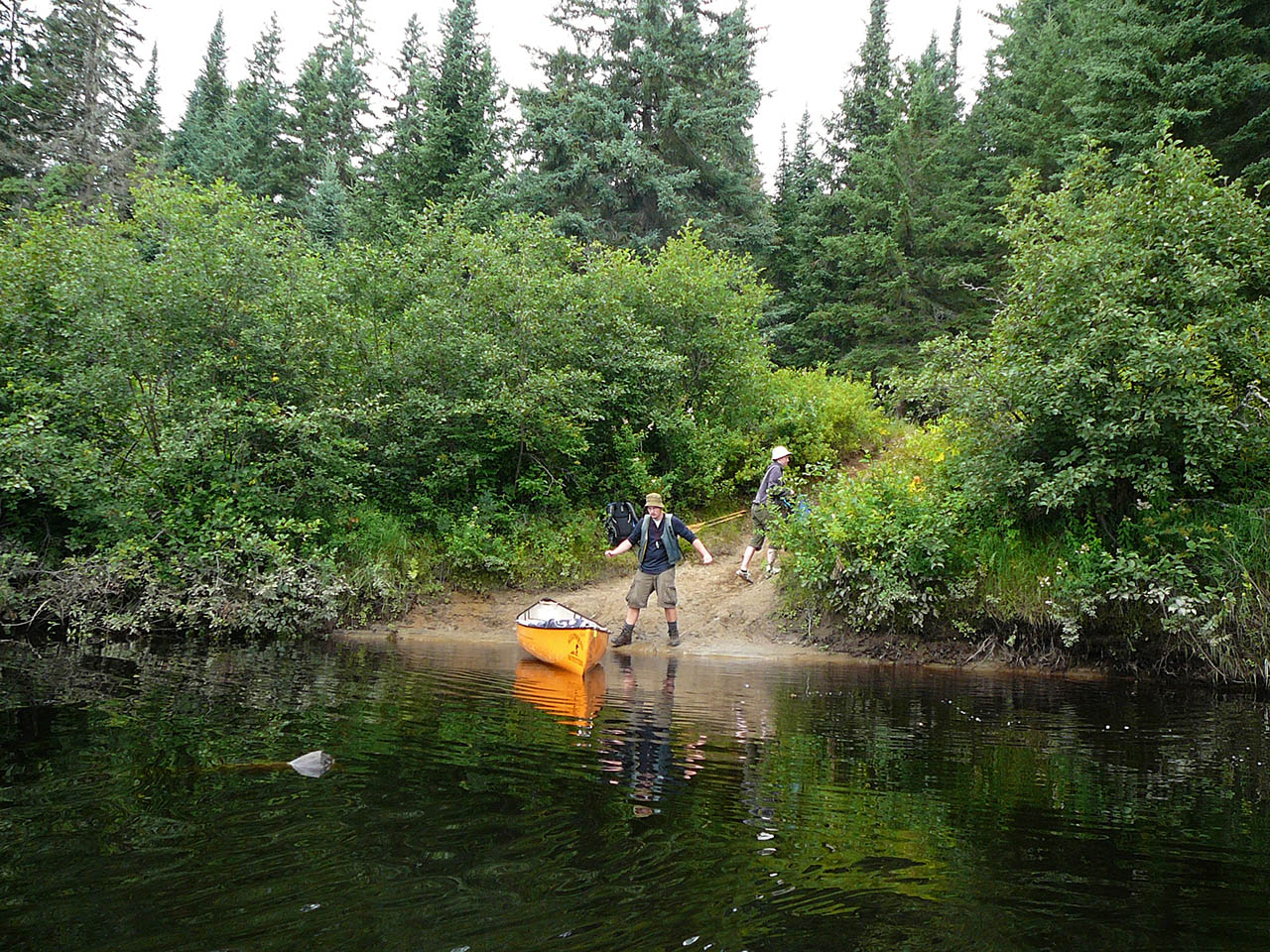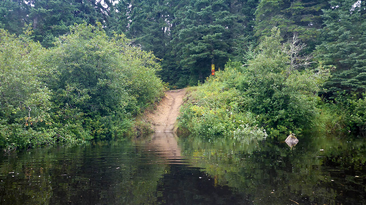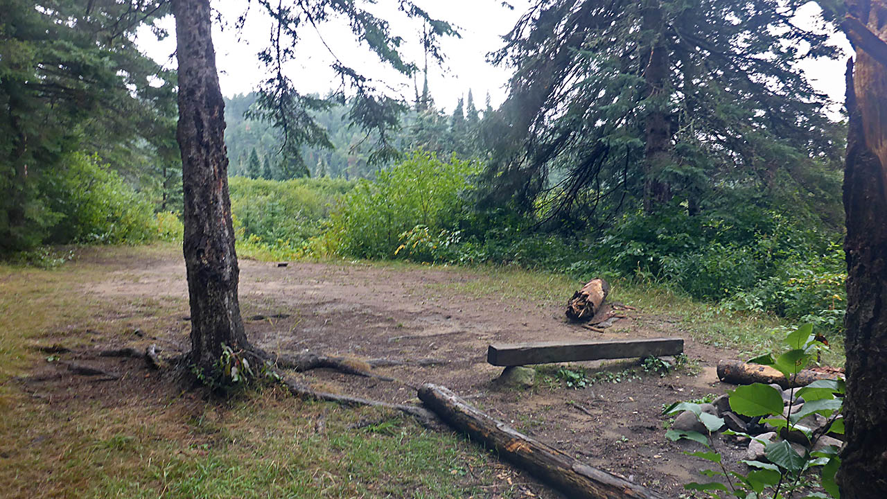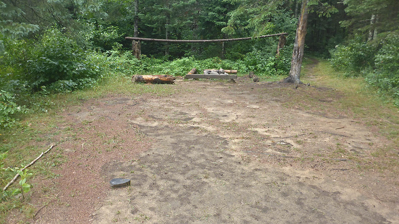 Landing Topography of under-water approach: Sand, steep drop-off. Impediments to disembarking from and/or unloading a canoe: Small, steep landing area. Topography to tent sites: Short, steep, sandy path leads directly to site. Landing for campsite and portage to Nadine Lake (mid-August 2018) ... Pic taken mid-August 2009, shows difference in water level along this portion of the Nipissing River ... Campsite Regular or low-maintenance: Regular Size of open area: 10m x 8m.