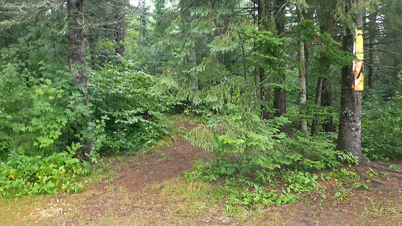 Extent of tree cover: 0%, all trees are on the perimeter. Degree of levelness: Flat and level. Number of tent sites: 5+. North exposure: Trees. East exposure: Trees. South exposure: River. West exposure: Trees. General description: Very flat and very level. There is 1 tree that could be considered to be on the site. Being surrounded by forest, there is good wind protection, but no protection from the middle of the day sun. Overall accessibility: Accessed by the 1410m portage from Nadine Lake, or from the Nipissing River, which is a steep climb to the site. View from top of landing, trail to Nadine Lake is to the right. ... Looking toward Nipissing River from trail ... Nadine Portage Reservation Area (#517) ... Submitted by Chris Taylor, January 12, 2019 .. visited August, 2018. |