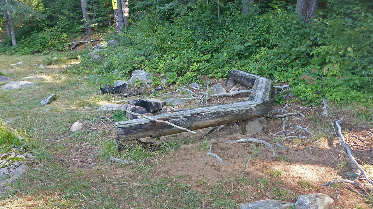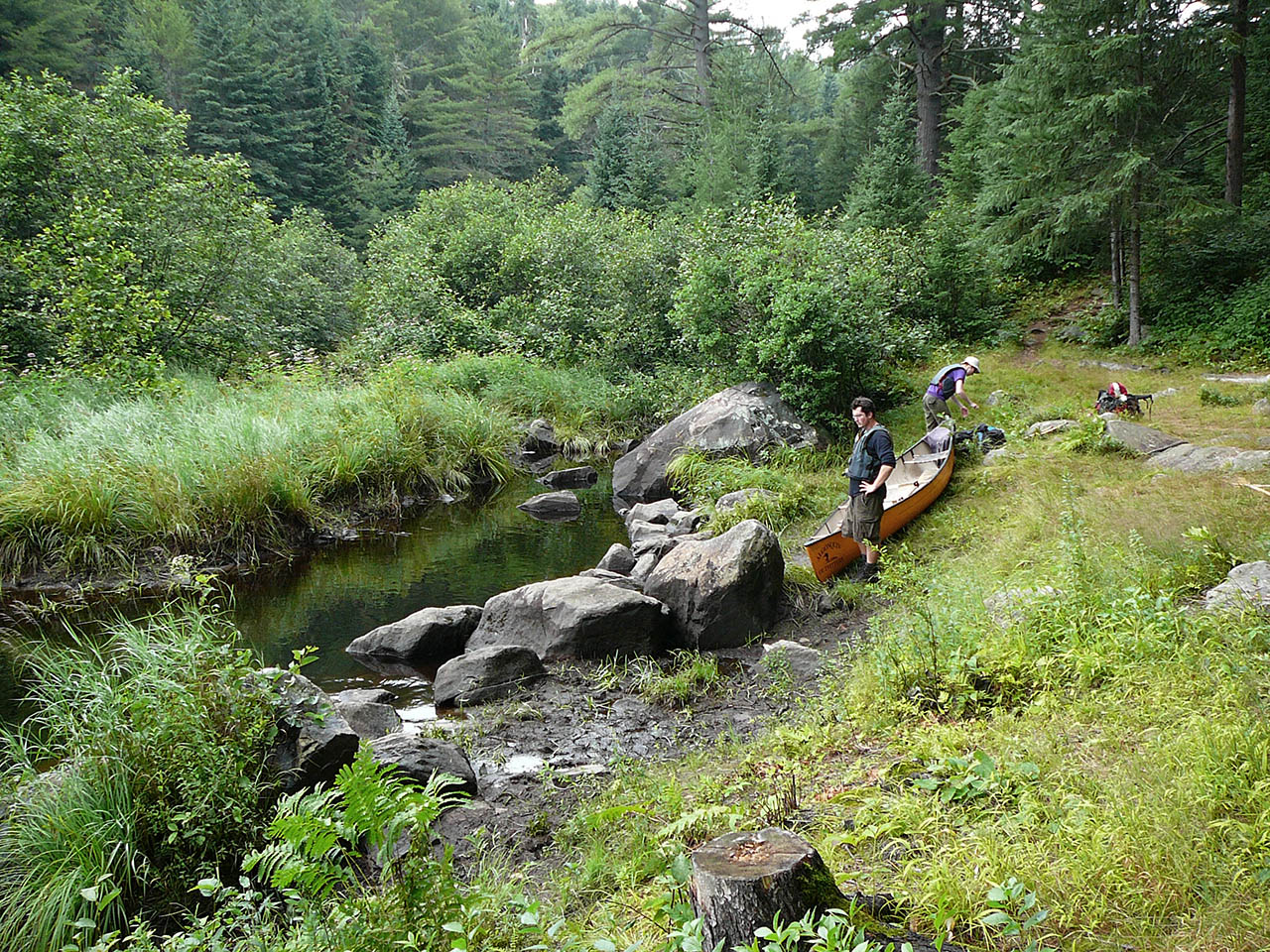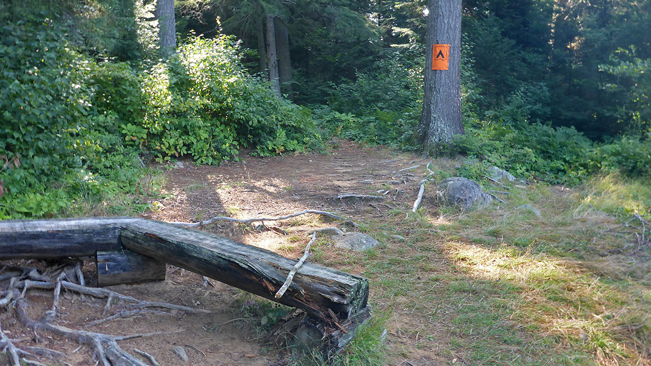 Landing Topography of under-water approach: Very rocky landing at eastern end of 245m Rolling Dam Portage. Impediments to disembarking from and/or unloading a canoe: Large/medium sized rocks. Topography to tent sites: Rocky, rooty ground. Pic of landing from Aug. 2009 shows much lower water level than 2018. Portage trail starts at top right corner ... Campsite Regular or low-maintenance: Regular Size of open area: 7m x 4m.