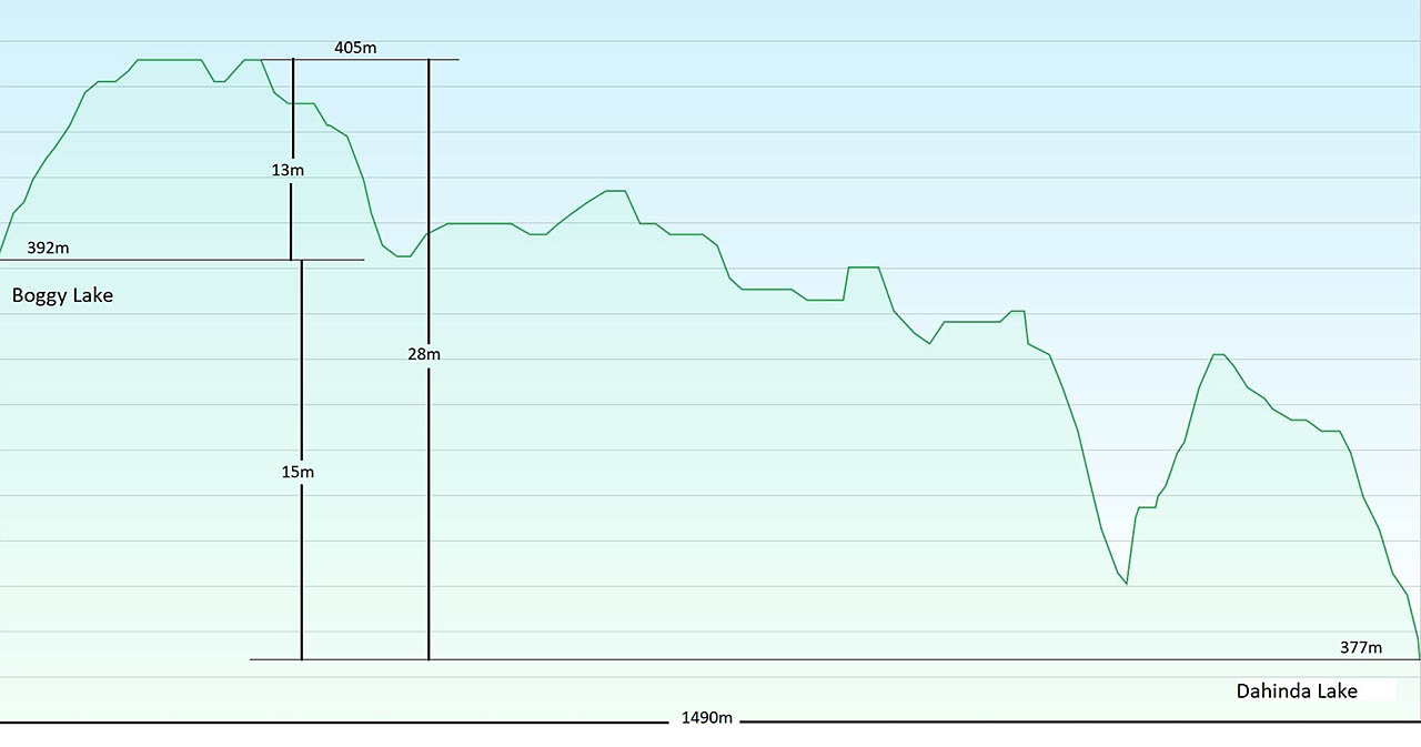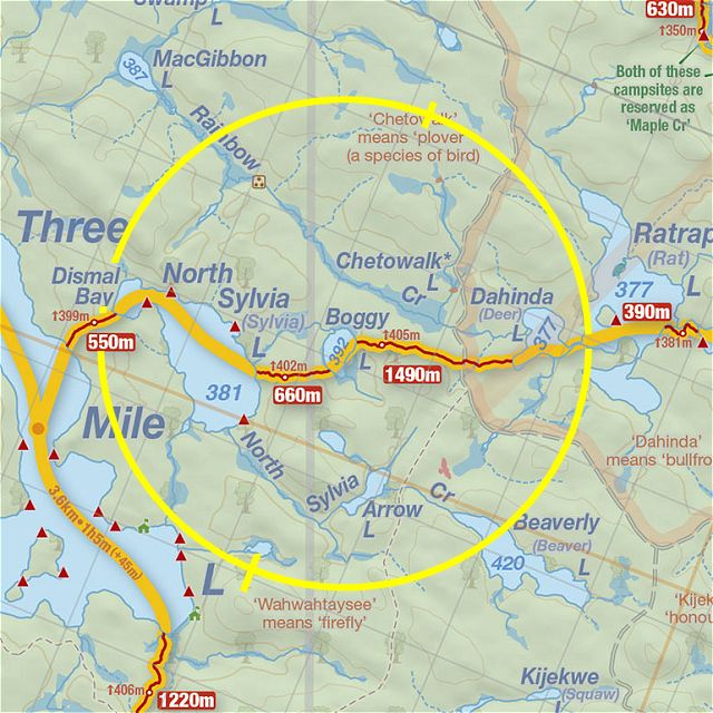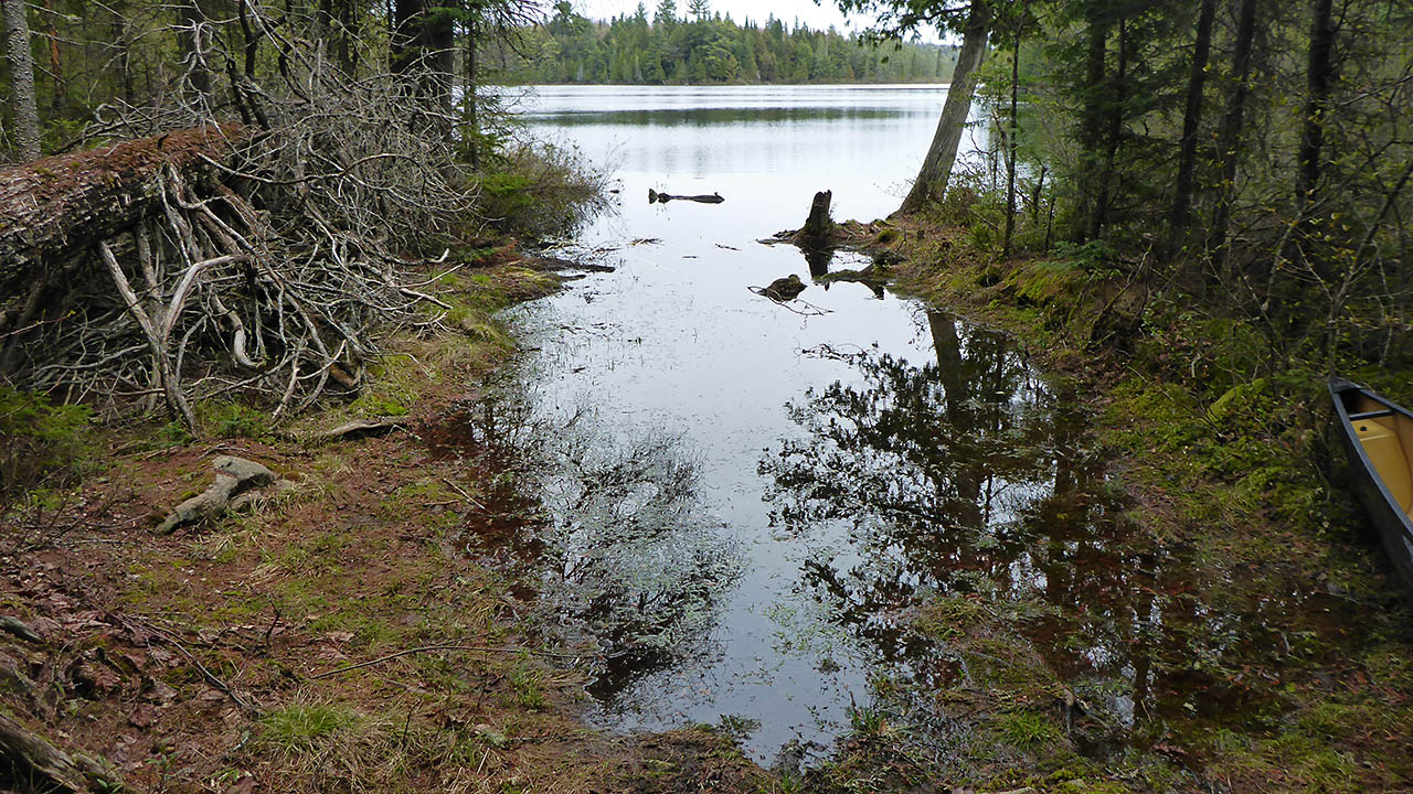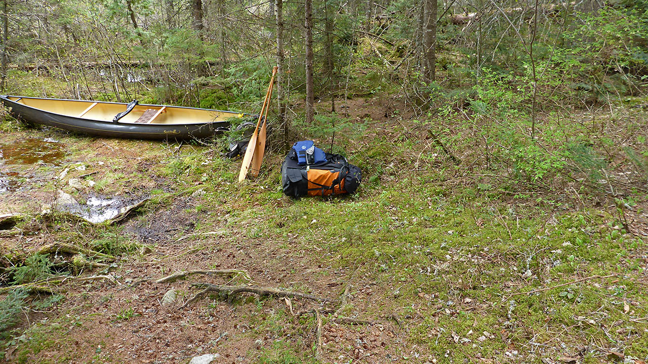 Length of portage: 1490 meters. Portage maintenance regular or low: Regular. Elevation above Sea Level @ Boggy Lake is 392 meters. Elevation above Sea Level @ Dahinda Lake is 377 meters. Difference in elevation: 15 meters (approx.). Elevation of highest point: 405 meters. Overall rise/fall: 28 meters. (Above data is extracted from 'Jeff's Map'.) Landing at Boggy Lake (elevation 392m) Topography of under-water approach: Large rocks in knee to thigh deep water. Impediments to disembarking from and/or unloading a canoe: A large rock fronts the landing, and would come into play during high or low water levels. Gear can be loaded/unloaded directly to shore. Topography of the ascending grade: A rocky, rooty trail with room to place gear leads away from landing. Impediments to moving gear to portage trail: None. A nice landing ...![]() ![]() Portage Trail (peak elevation 405 meters) Cross-section profile ...![]() Landing at Dahinda Lake (elevation 377m) Topography of under-water approach: Mud and silt. Impediments to disembarking from and/or unloading a canoe: In high water, the landing is very wet so gear had to be unloaded and moved further up trail to the dryer staging area. Topography of the ascending grade: A rocky, rooty start to the trail. Impediments to moving gear to portage trail: Only an issue in high water. Landing seen from the water ...![]() ![]() ![]() ![]() ![]() Thanks to Jeffrey McMurtrie of Jeff'sMap for supplying the base-layer map component by Creative Commons licensing. Submitted by Chris Taylor, visited May 2015, submitted December 2019 |