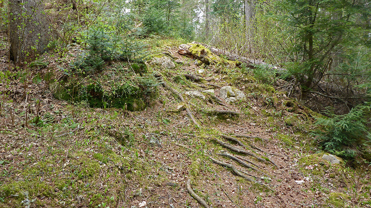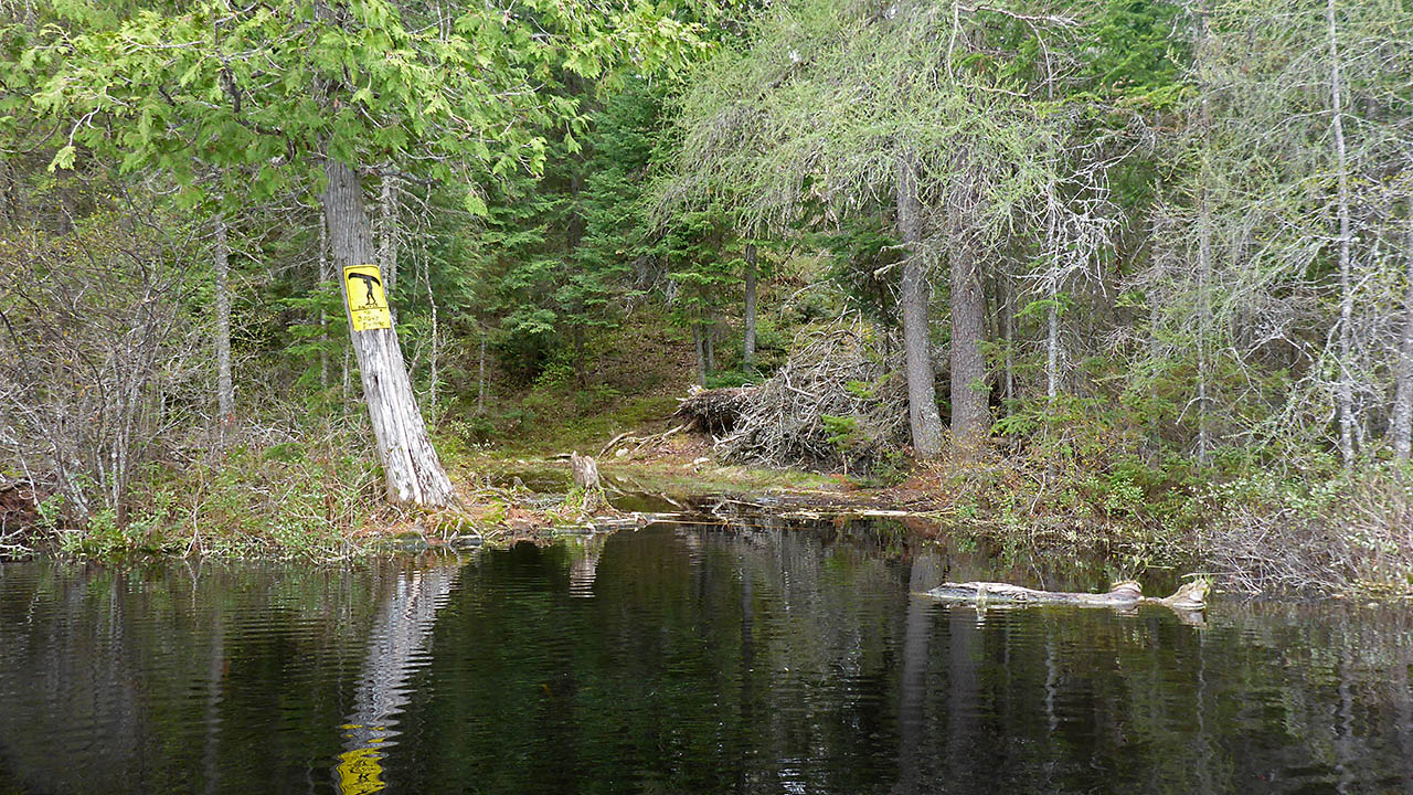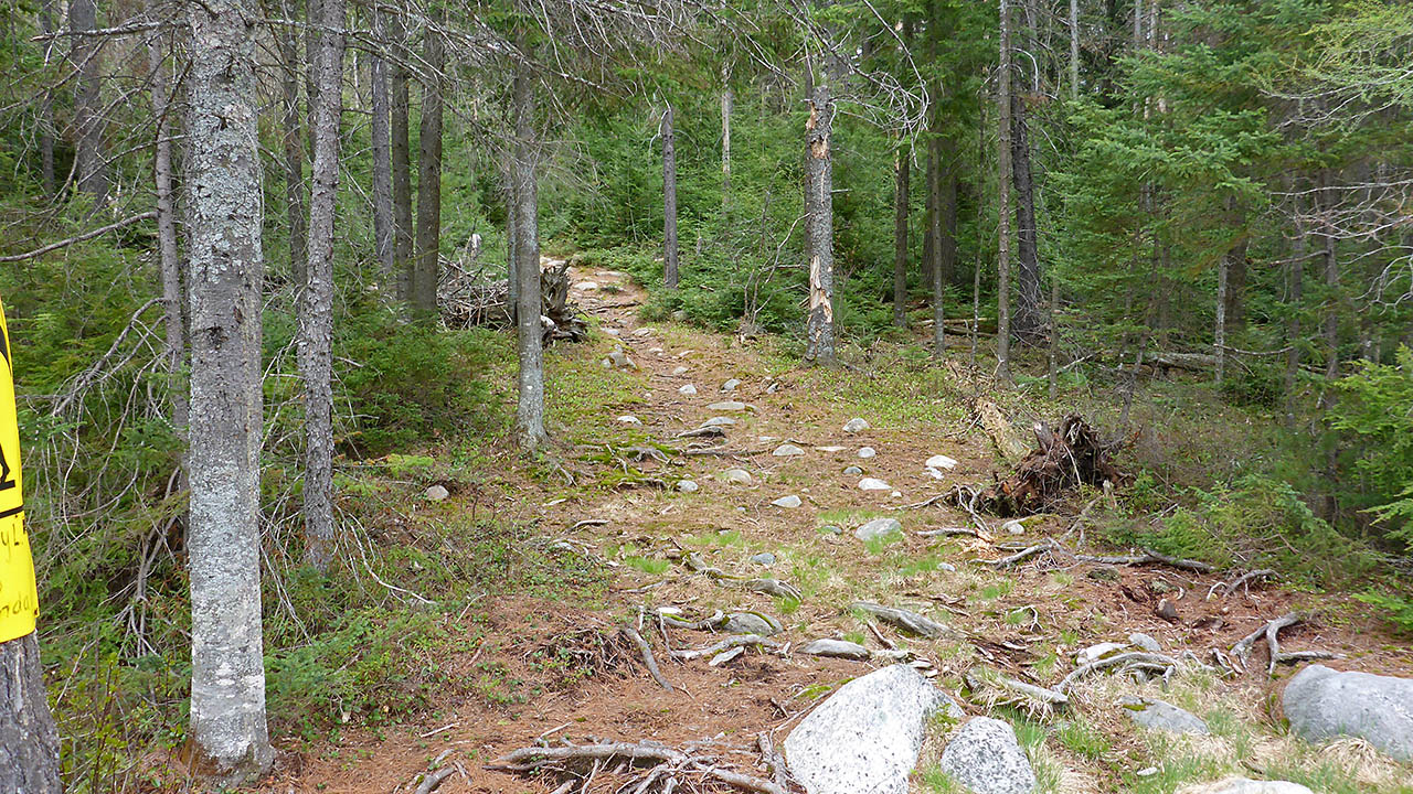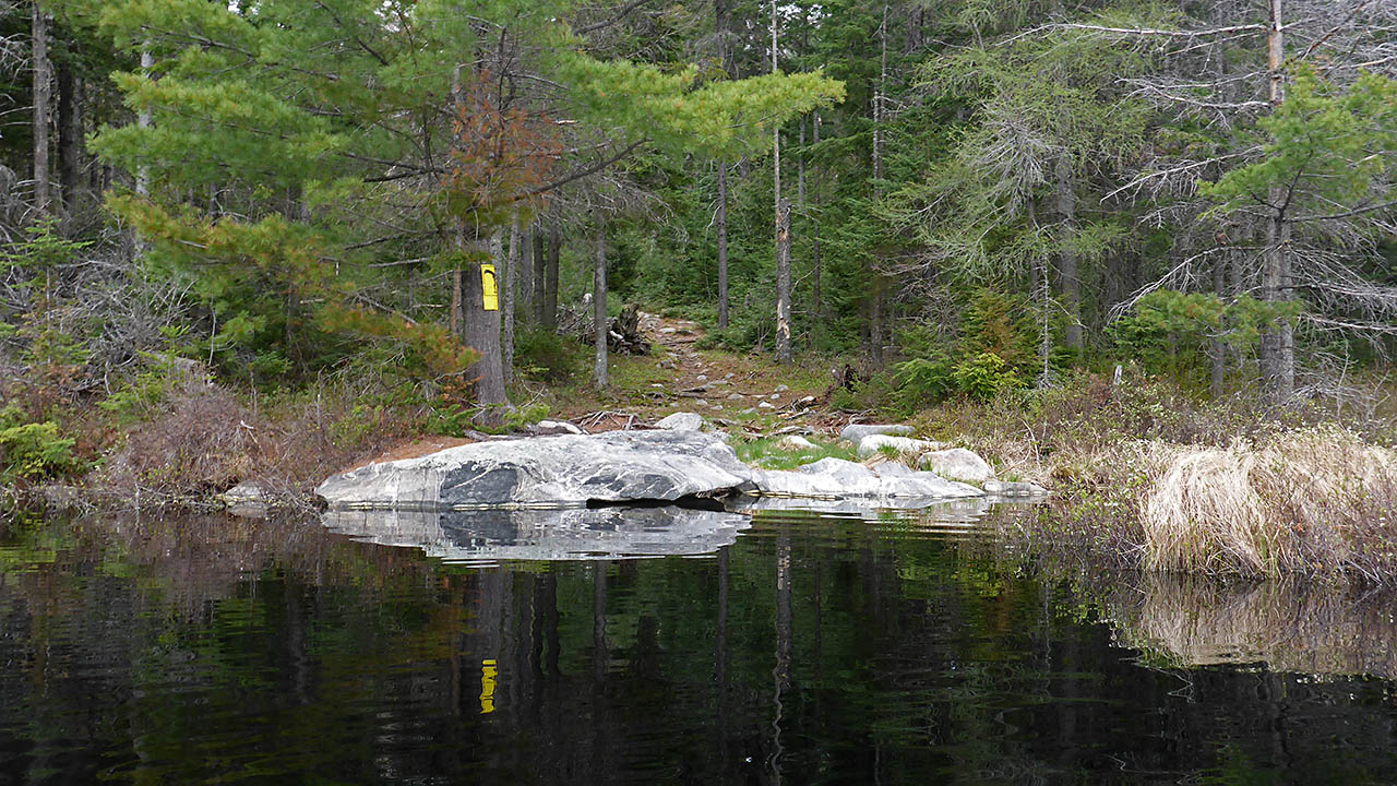 Length of portage: 1490 meters. Portage maintenance regular or low: Regular. Elevation above Sea Level @ Boggy Lake is 392 meters. Elevation above Sea Level @ Dahinda Lake is 377 meters. Difference in elevation: 15 meters (approx.). Elevation of highest point: 405 meters. Overall rise/fall: 28 meters. (Above data is extracted from 'Jeff's Map'.) Landing at Boggy Lake (elevation 392m) Topography of under-water approach: Large rocks in knee to thigh deep water. Impediments to disembarking from and/or unloading a canoe: A large rock fronts the landing, and would come into play during high or low water levels. Gear can be loaded/unloaded directly to shore. Topography of the ascending grade: A rocky, rooty trail with room to place gear leads away from landing. Impediments to moving gear to portage trail: None. A nice landing ...![]() ![]() Portage Trail (peak elevation 405 meters) Cross-section profile ...![]() Landing at Dahinda Lake (elevation 377m) Topography of under-water approach: Mud and silt. Impediments to disembarking from and/or unloading a canoe: In high water, the landing is very wet so gear had to be unloaded and moved further up trail to the dryer staging area. Topography of the ascending grade: A rocky, rooty start to the trail. Impediments to moving gear to portage trail: Only an issue in high water. Landing seen from the water ...![]() ![]() ![]() ![]() ![]() Thanks to Jeffrey McMurtrie of Jeff'sMap for supplying the base-layer map component by Creative Commons licensing. Submitted by Chris Taylor, visited May 2015, submitted December 2019 |