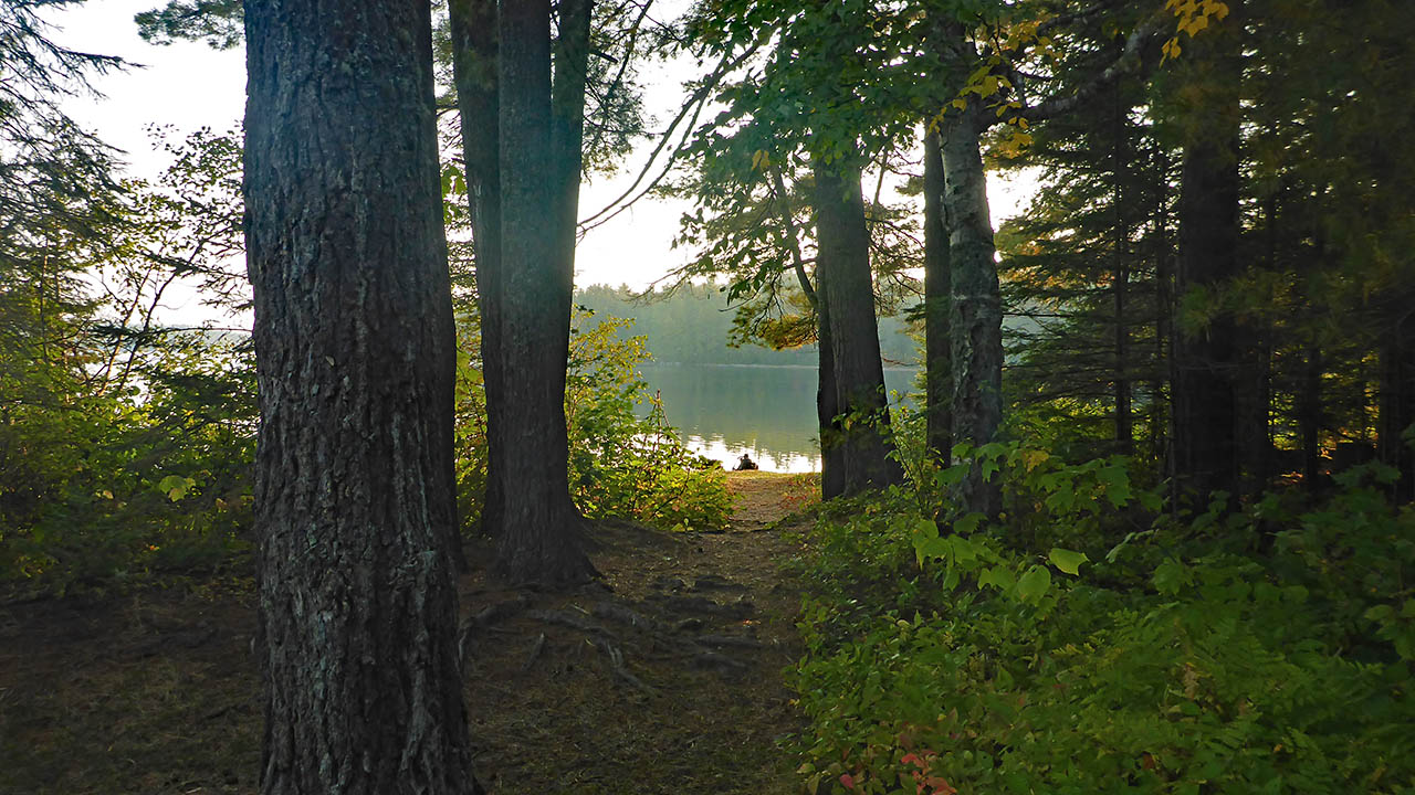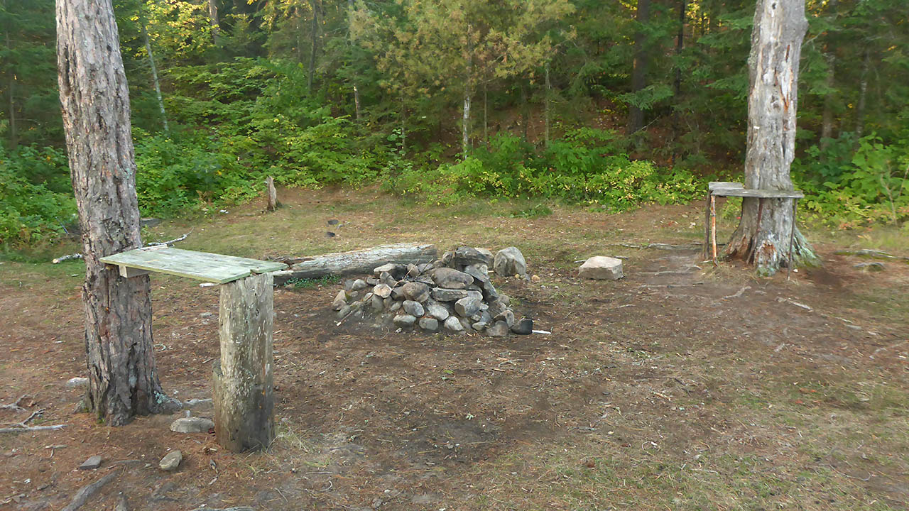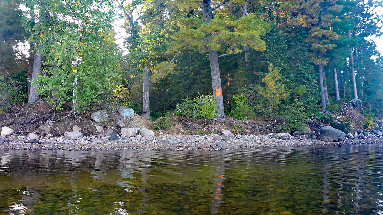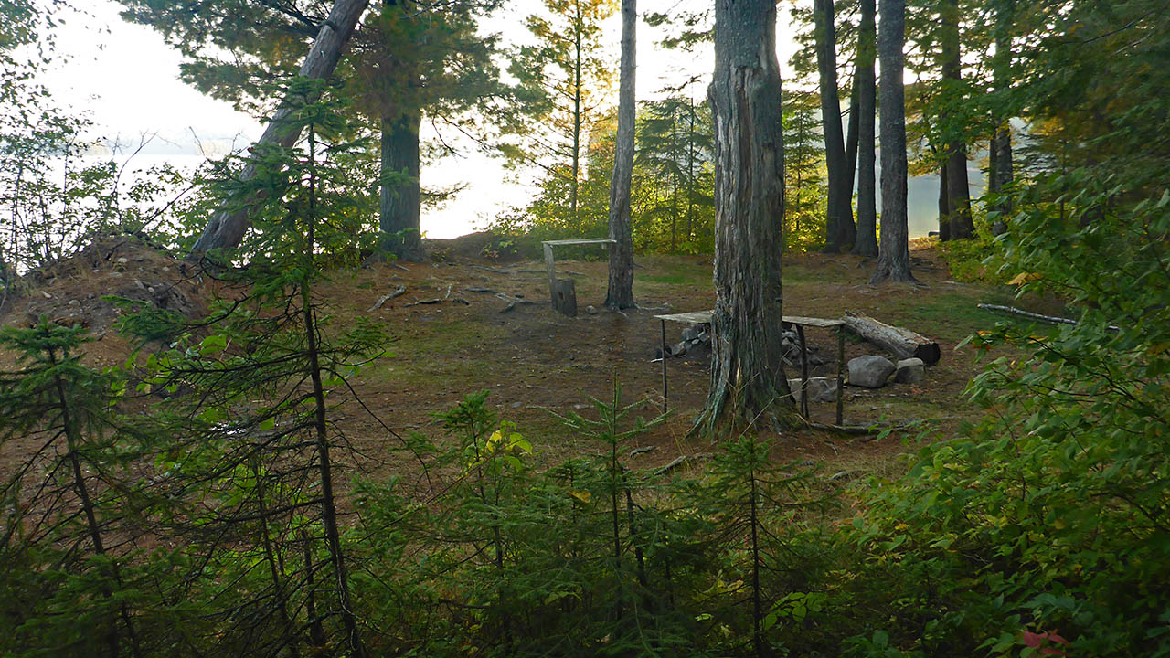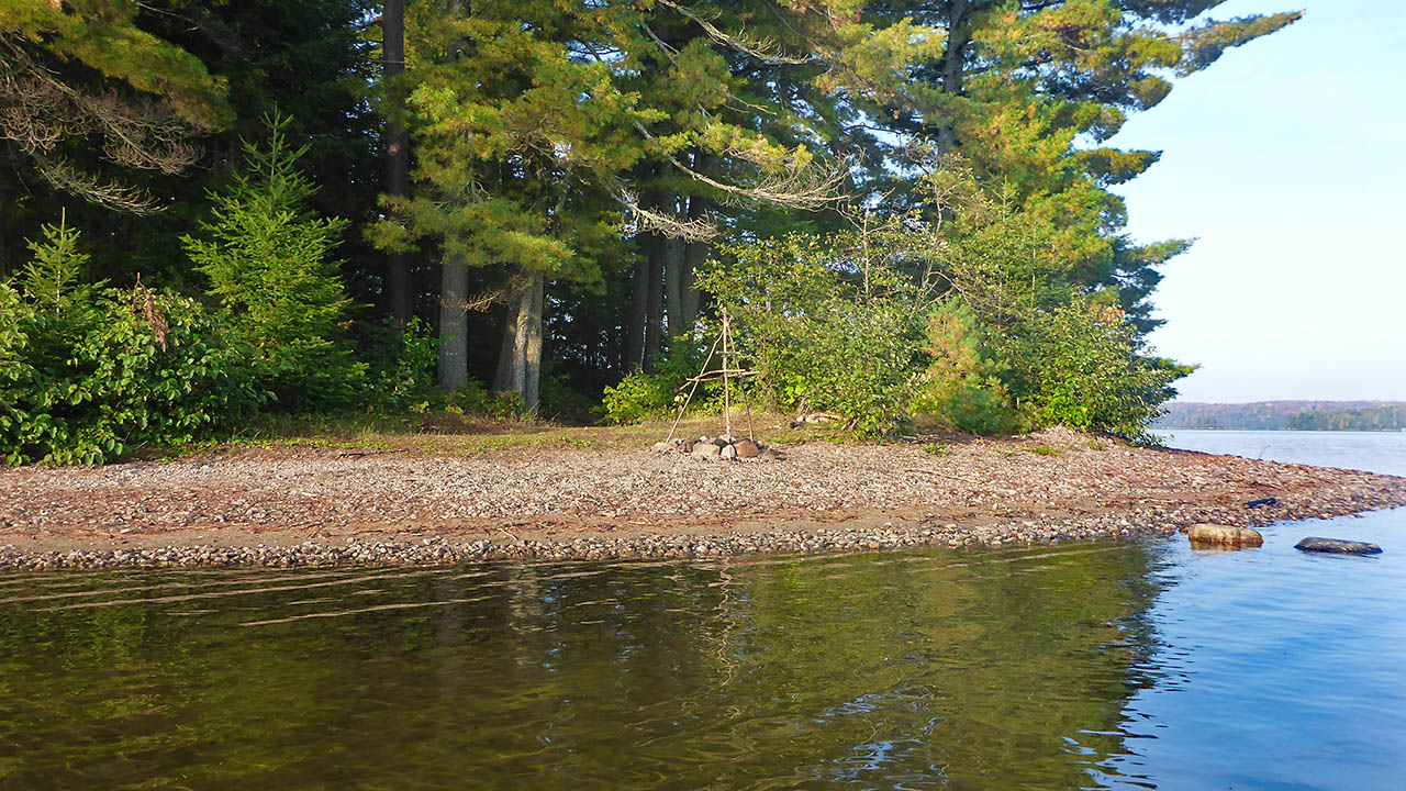 Landing Topography of under-water approach: Shallow, gravel beach. Impediments to disembarking from and/or unloading a canoe: None. Topography leading to tent sites: Site is accessed from the front by a slight rise around/over a fallen tree, or a slightly rooty path from the beach on the northeast side of campsite.