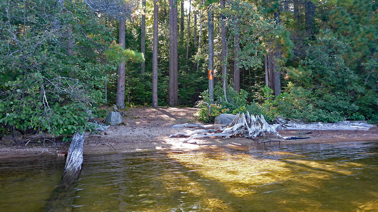 Landing Topography of under-water approach: Shallow, sandy beach. Impediments to disembarking from and/or unloading a canoe: None. Topography leading to tent sites: A slight rise, sandy soil.