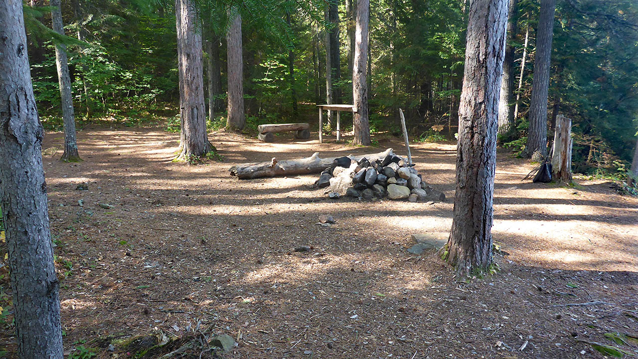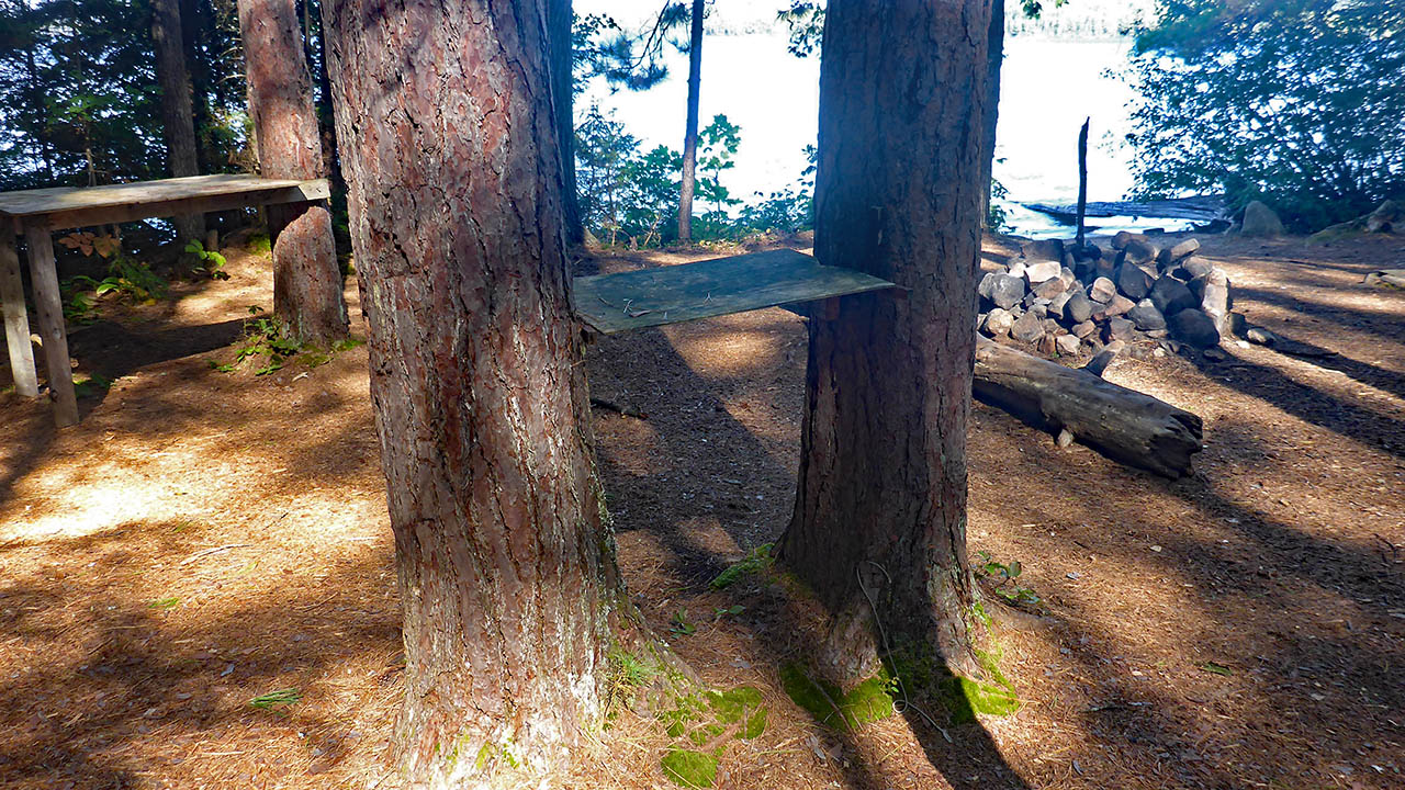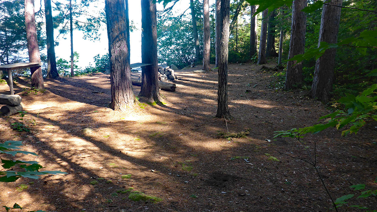 Campsite Campsite maintenance: Regular. Size of open area: 15m x 8m. Extent of tree cover: 80%. Degree of levelness: level. Number of level tent sites: 3+. North exposure: Lake Opeongo. East exposure: trees. South exposure: trees. West exposure: trees. General description: A compact site that is level and could handle 3 tents (more could be pitched, but it would be crowded). Very protected from all but a north wind.Overall accessibility: No issues as it is a short carry to campsite.
