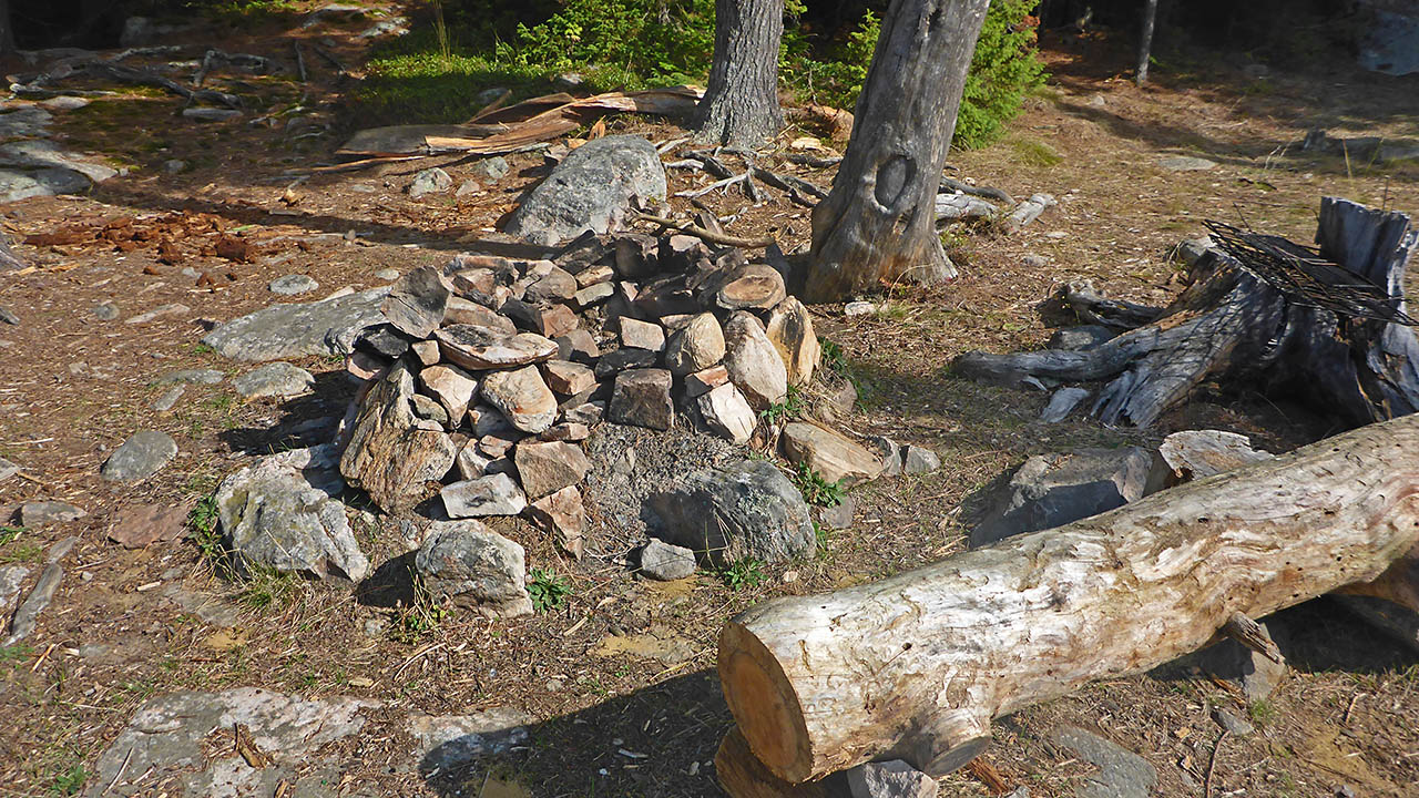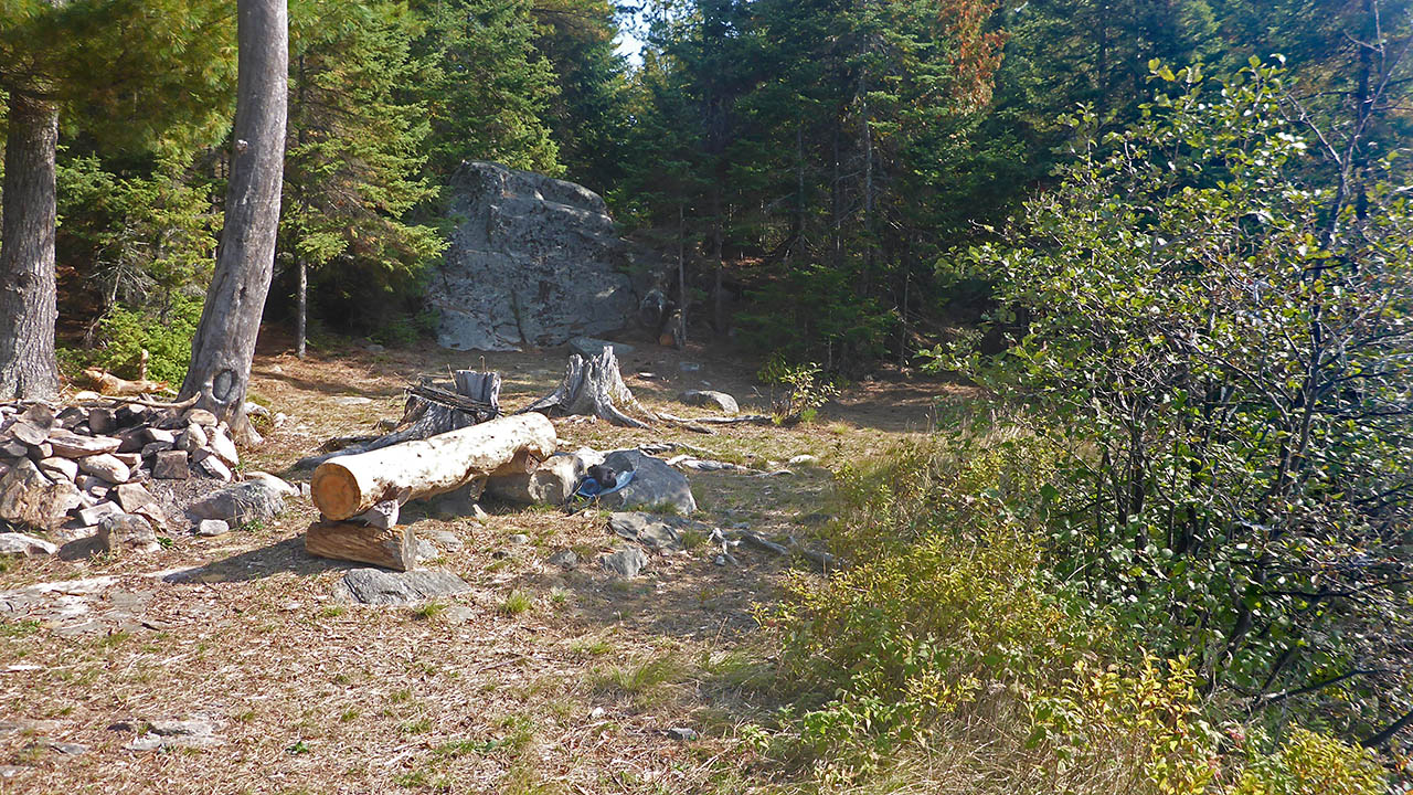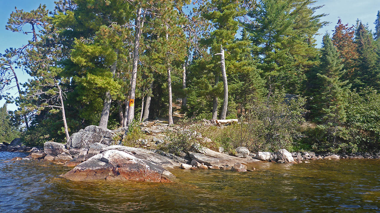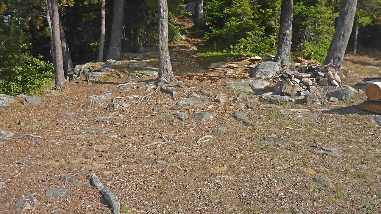 Landing Topography of under-water approach: Large rocks form the shorline. Impediments to disembarking from and/or unloading a canoe: Rocks are large enough that they form a shallow landing area. Topography leading to tent sites: Slightly uphill over rocky ground.