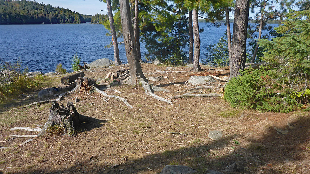 Campsite Campsite maintenance: Regular. Size of open area: Pie shaped 15m (deep) x 15m (at widest). Extent of tree cover: 20%. Degree of levelness: slightly angled. Number of level tent sites: 1. North exposure: trees. East exposure: Lake Opeongo. South exposure: Lake Opeongo. West exposure: Lake Opeongo. General description: Very open site with little protection from the elements. The ground is mostly rocky and rooty that limits the number of tenting options. One tent site that could be considered flat, and another that could be used in a pinch. Pie shaped, but only about 8m at the back (east side) of site could be used for tenting, hammocks could easily be hung in the other area.Overall accessibility: No real issues other than the rock could be slippery when wet.