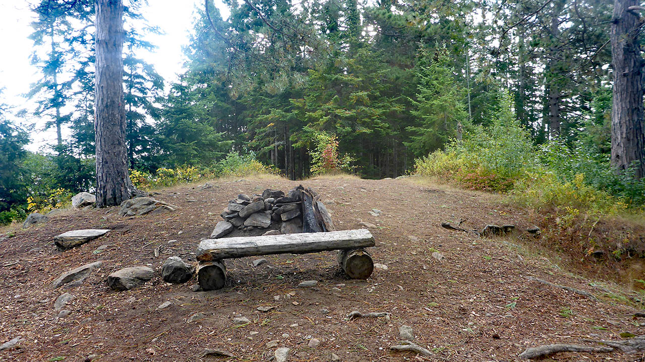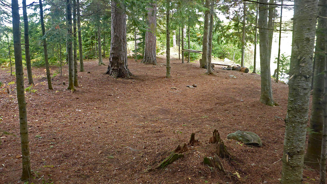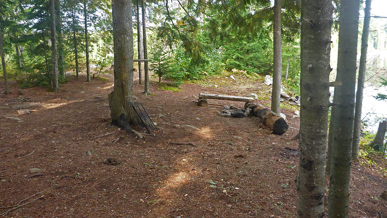 Campsite Campsite maintenance: Regular. Size of open area: 25m x 8m. Extent of tree cover: 100% at back half of site. Degree of levelness: Firepit area is noticeably sloped, tenting area is good. Number of level tent sites: 3. North exposure: Channel to North Arm. East exposure: trees. South exposure: trees. West exposure: water, eastern shore of lake. General description: Even thou the area seems large, the first 15m are not useful for tenting (possible for a hammock). The tenting area is well protected, but open to the north. A 2nd firepit has been made in the tenting area, but I don't recommend using it as there are low hanging tree branches very close.Overall accessibility: No real issues, the climb to the tenting area is angled.