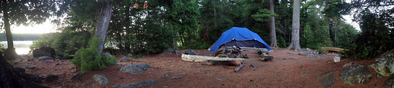 Campsite Campsite maintenance: Regular. Size of open ground area: The open ground area of the campsite is approx. half the island and around 30x30ft. Extent of tree cover: Tree coverage on the back half of the island, some trees covering the perimeter/shoreline of the campsite area. Lots of smaller shrubs/bushes by the shoreline. Degree of levelness: Very level and flat. Number of level tent-sites: Can fit 1-3 tents. I was able to pitch an 8-man tent, which could probably accommodate 2 smaller tents. Might also be able to makeshift 1 more small tent area elsewhere. North exposure: Island is very small and campsite faces north, very exposed to northern winds. East exposure: Exposed to winds. South exposure: Island is small and exposed to winds from all directions, but tree coverage behind campsite makes the site least exposed to the south. West exposure: Exposed to winds.