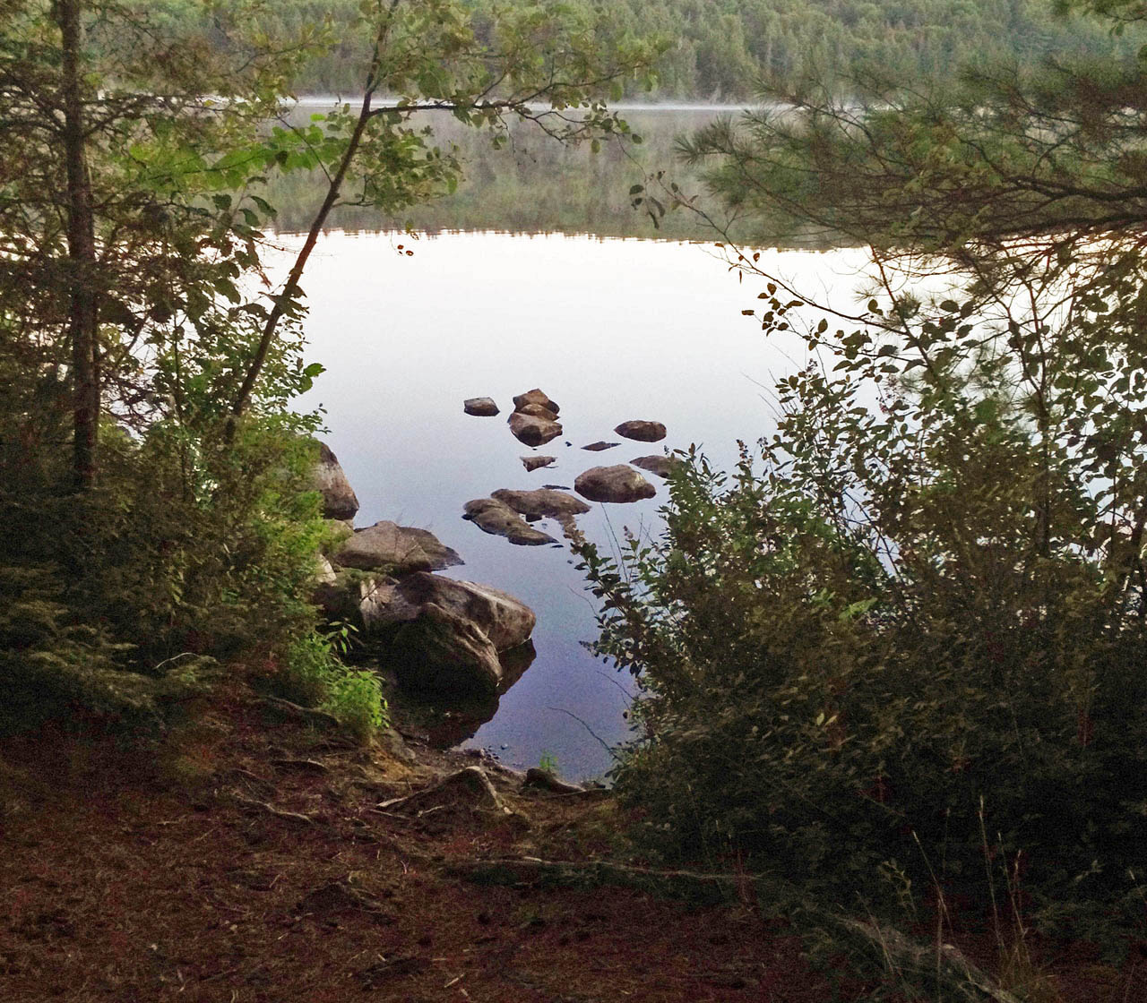 Landing Topography of under-water approach: Shallow scattered rocks in front of the site, landing is a bit rocky/muddy with lots of roots. Impediments to disembarking from and/or unloading a canoe: None. Small landing with a short steep 1-2 ft incline with lots of roots sticking out of the ground, which can make it a bit tricky to unload, but won’t be a major issue. Topography to tent sites: 1-2ft incline from landing to campsite, rest of island is flat.