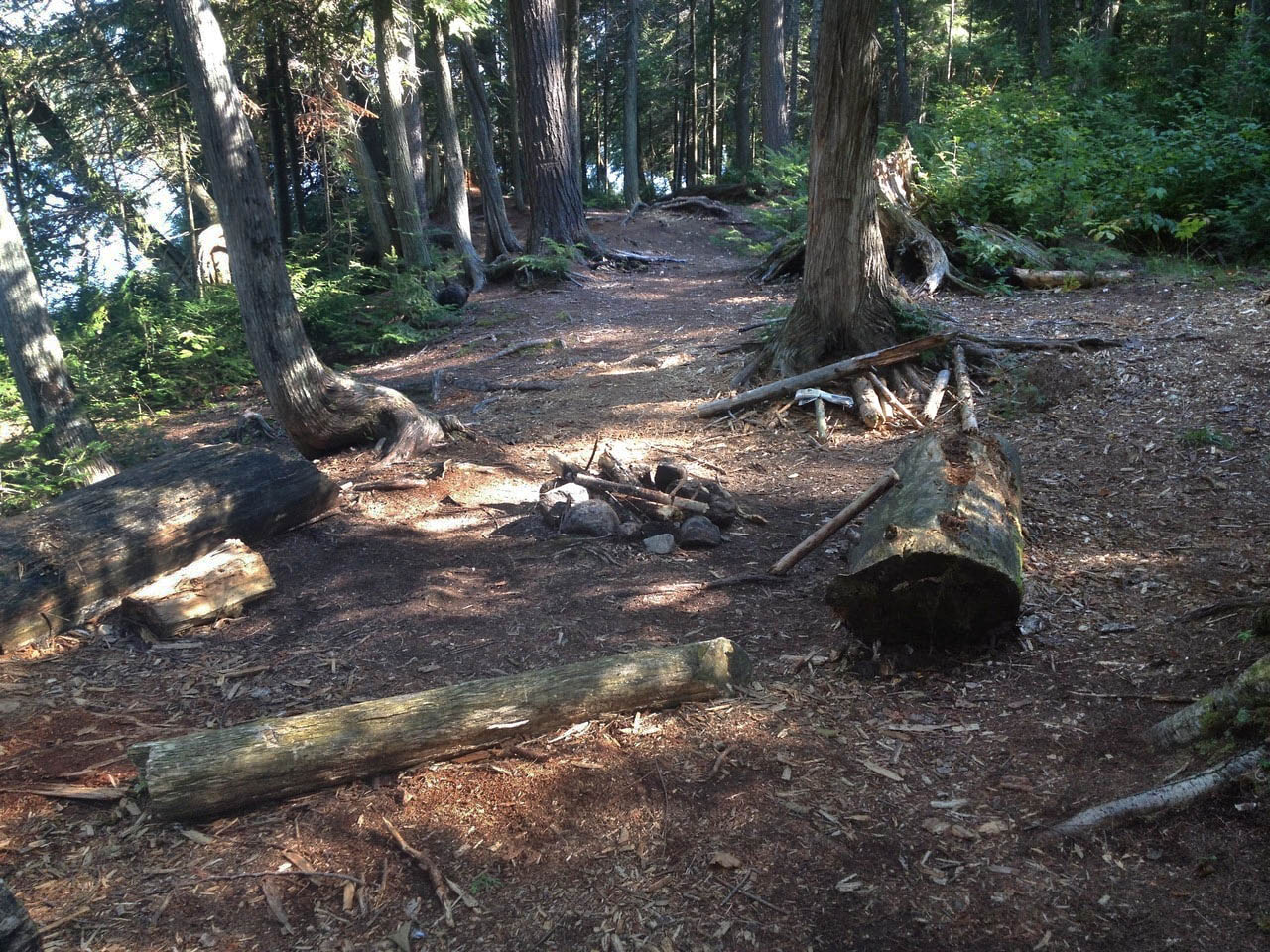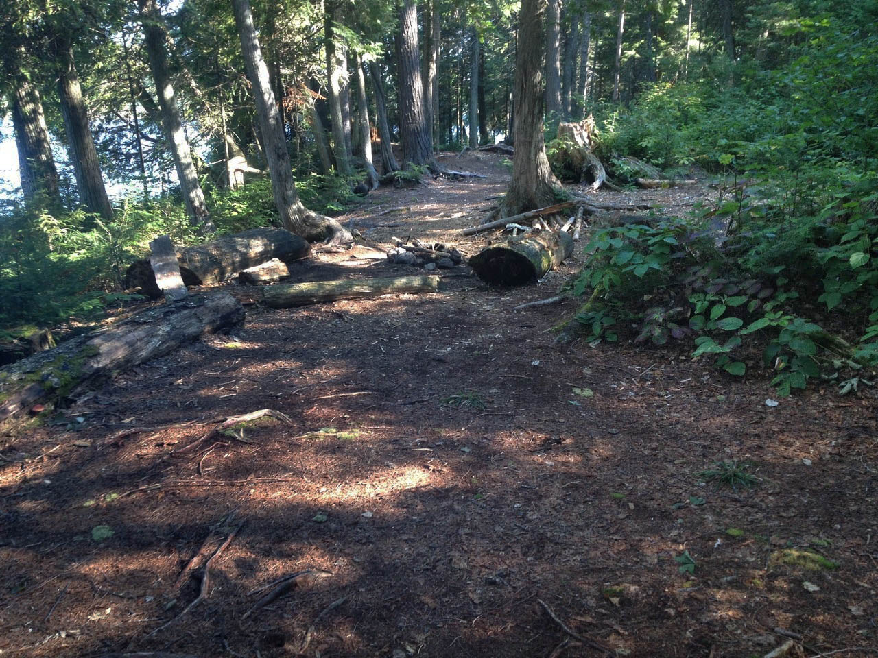 Campsite Campsite maintenance: Regular. Size of open ground area: Very little. Extent of tree cover: Dense forest surrounding campsite, lots of bushes/shrubs along the shoreline. Degree of levelness: Flat campsite throughout. Number of level tent-sites: 1 - 2. North exposure: Bushes along the northern shoreline protecting the campsite from northern winds. East exposure: Trees surrounding campsite. South exposure: Dense forest behind campsight. West exposure: Trees surrounding campsite.