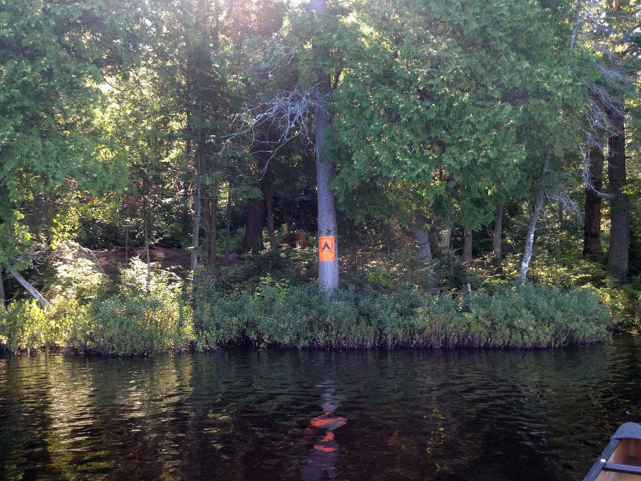 Landing Topography of under-water approach: Shallow water, lots of bushes on shoreline. Impediments to disembarking from and/or unloading a canoe: Nothing major. Topography to tent sites: Flat, no incline.
