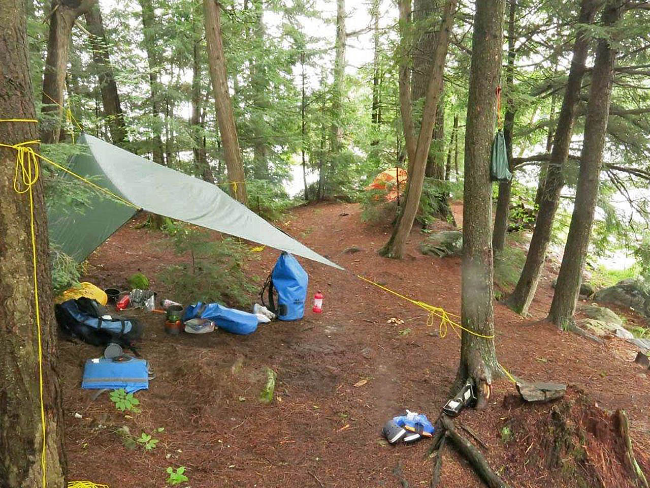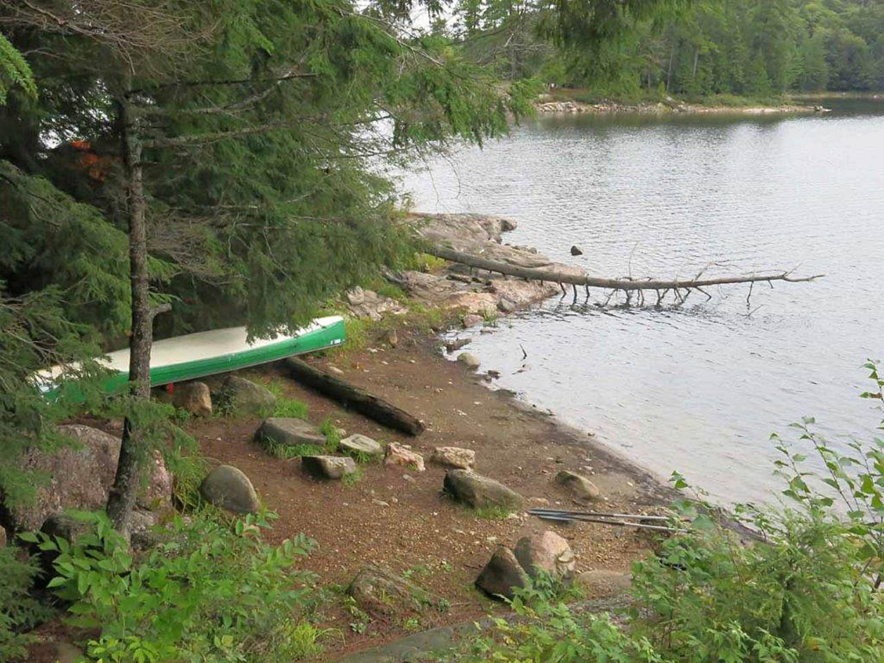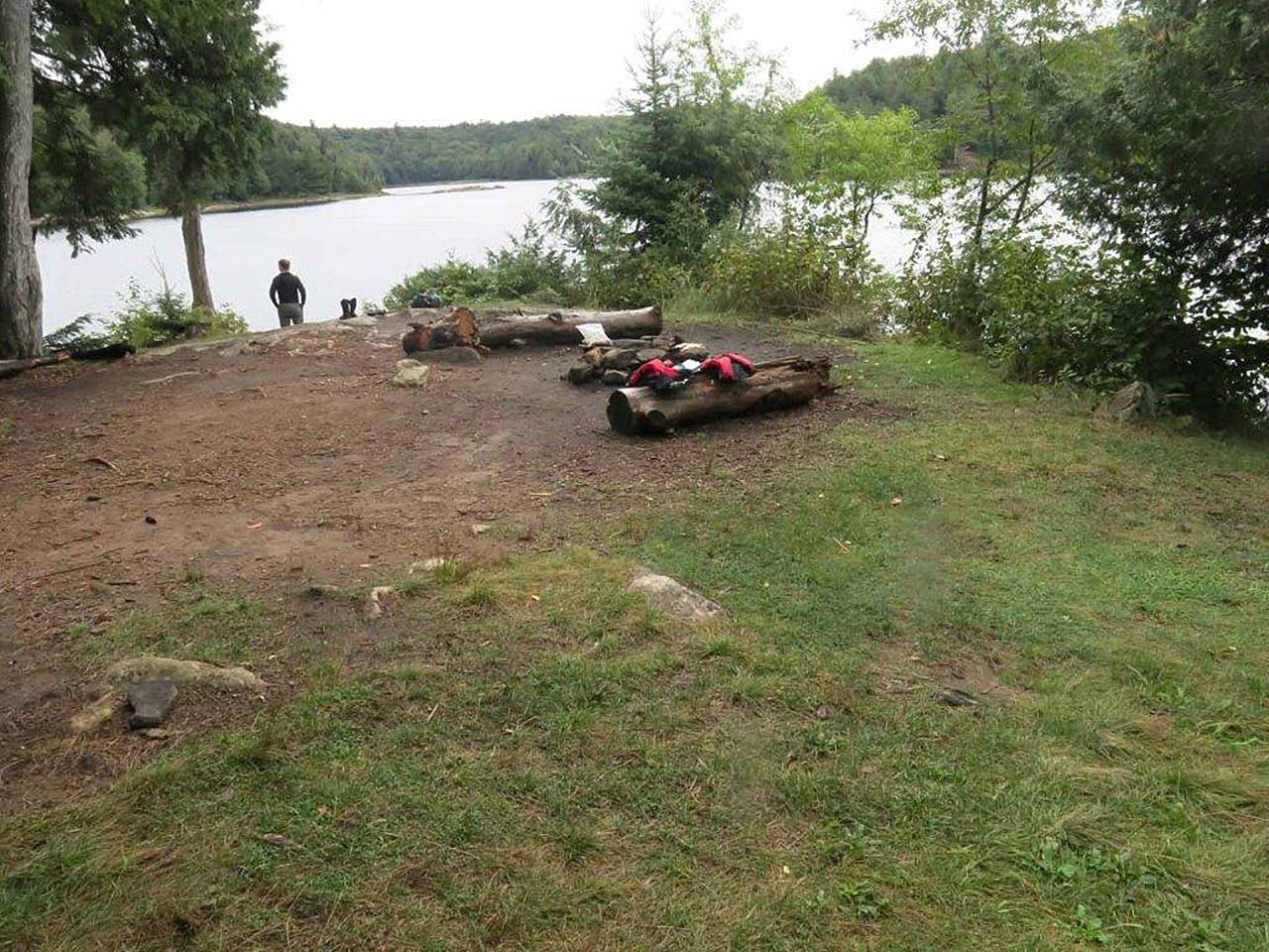 Landing Topography of under-water approach: Easy, sandy beach. Impediments to disembarking from and/or unloading a canoe: None. Topography to tent sites: Rise of 10' or so. Looking across the landing area ... Campsite Regular or low-maintenance: Regular. Size of open ground area: 40' x 60'. Extent of tree cover: No trees over large fire-pit area. Degree of levelness: Tent-pad area is level .. the rest is on a slope. Number of tent sites: 3. North exposure: Hill and trees. East exposure: Lake. South exposure: Channel and shrubs. West exposure: Trees. Large open area by the fire-pit ... General description: Large with, with room for three tents. While it is mostly uphill, the tent area is level and under the trees (cedars & maples). However, it is close to other campsites. Overall accessibility: easy - moderate..