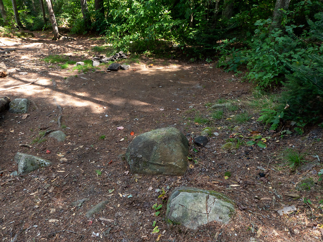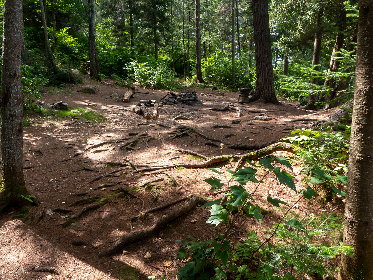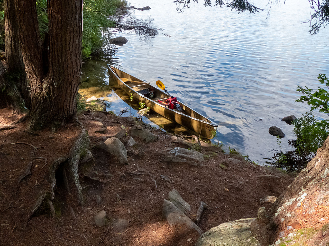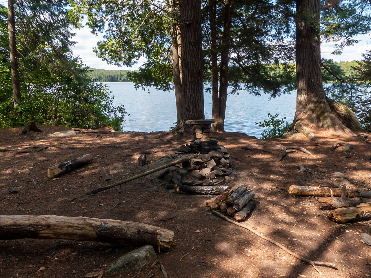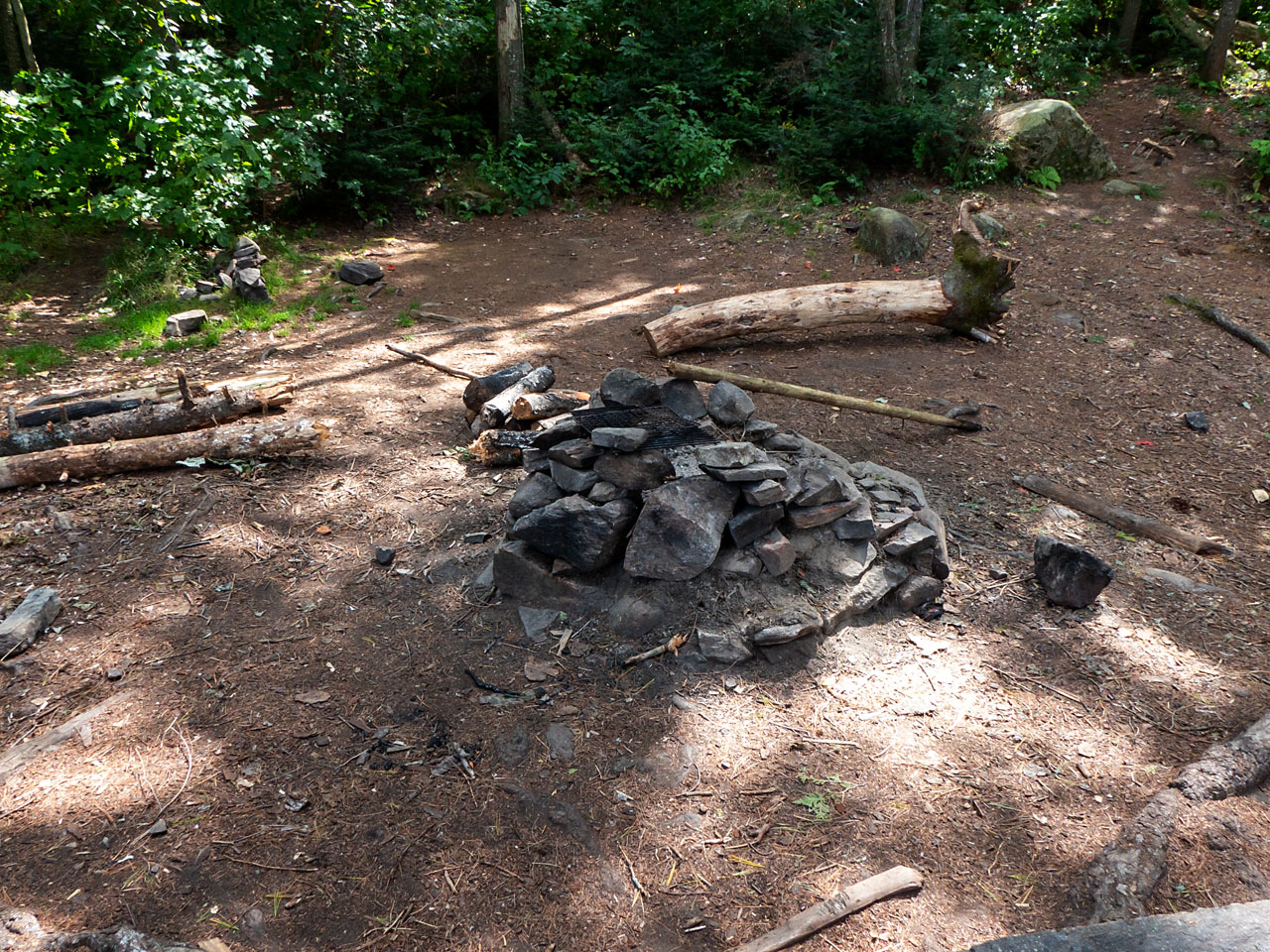 Landing Topography of under-water approach: Approach is over flat rock and sand with a few protuding small round boulders. Impediments to disembarking from and/or unloading a canoe: Broken shoreline requires 'feet-in-the-water' at the landing. Topography to tent sites: Rise of approx. 6'. Landing area from the water ... Looking down to the landing area ... Campsite Regular or low-maintenance: Regular. Size of open ground area: 50' x 25'. Extent of tree cover: Tall trees over both fire-pit and tentsite area. Open under overhead canopy. Degree of levelness: Only somewhat level. Number of tent sites: 1. Fire pit is central in the campsite. North exposure: View of the lake through some shoreline growth. East exposure: Forest. South exposure: Forest. West exposure: Forest. Looking across the campsite, which is generally sloping and rough ... The firepit, with the only level tentssite behind it ... Closer view of the tentsite ... View looking north across the firepit ... General description: Very shallow and rough, with limited tentsite area and a poor view. Overall accessibility: 'So-so'.