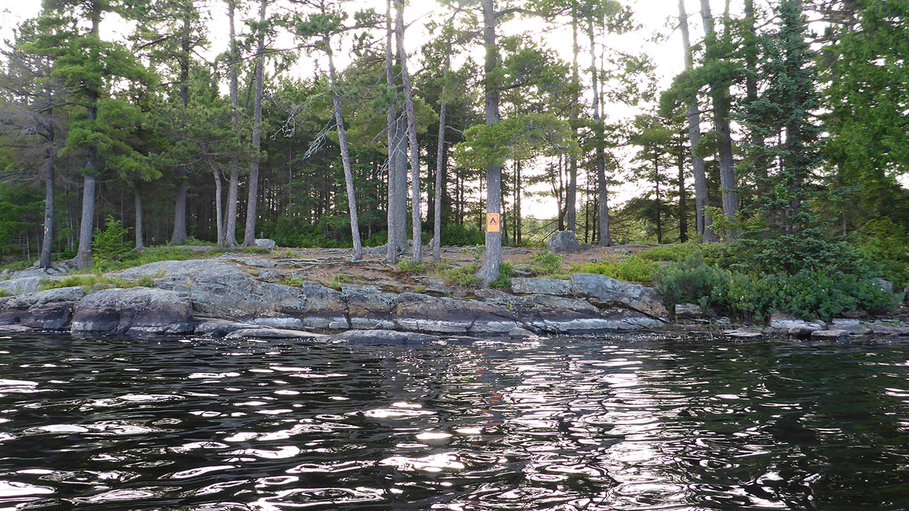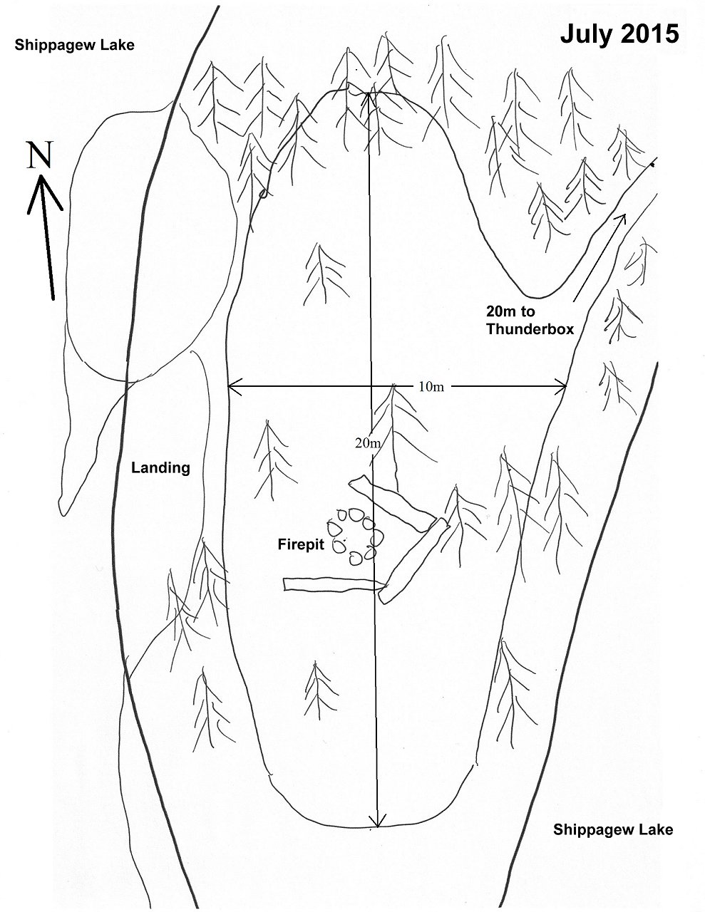 Campsite Location GPS - UTM location: N45° 46.974' W78° 41.498' (east side of lake). Landing Topography of under-water approach: Small rock and gravel. Water is too deep to stand in. Impediments to disembarking from and/or unloading a canoe: None, there is a natural slip that can accomodate one canoe. Topography leading to tent sites: A smooth rock that elevates approx. 1m.