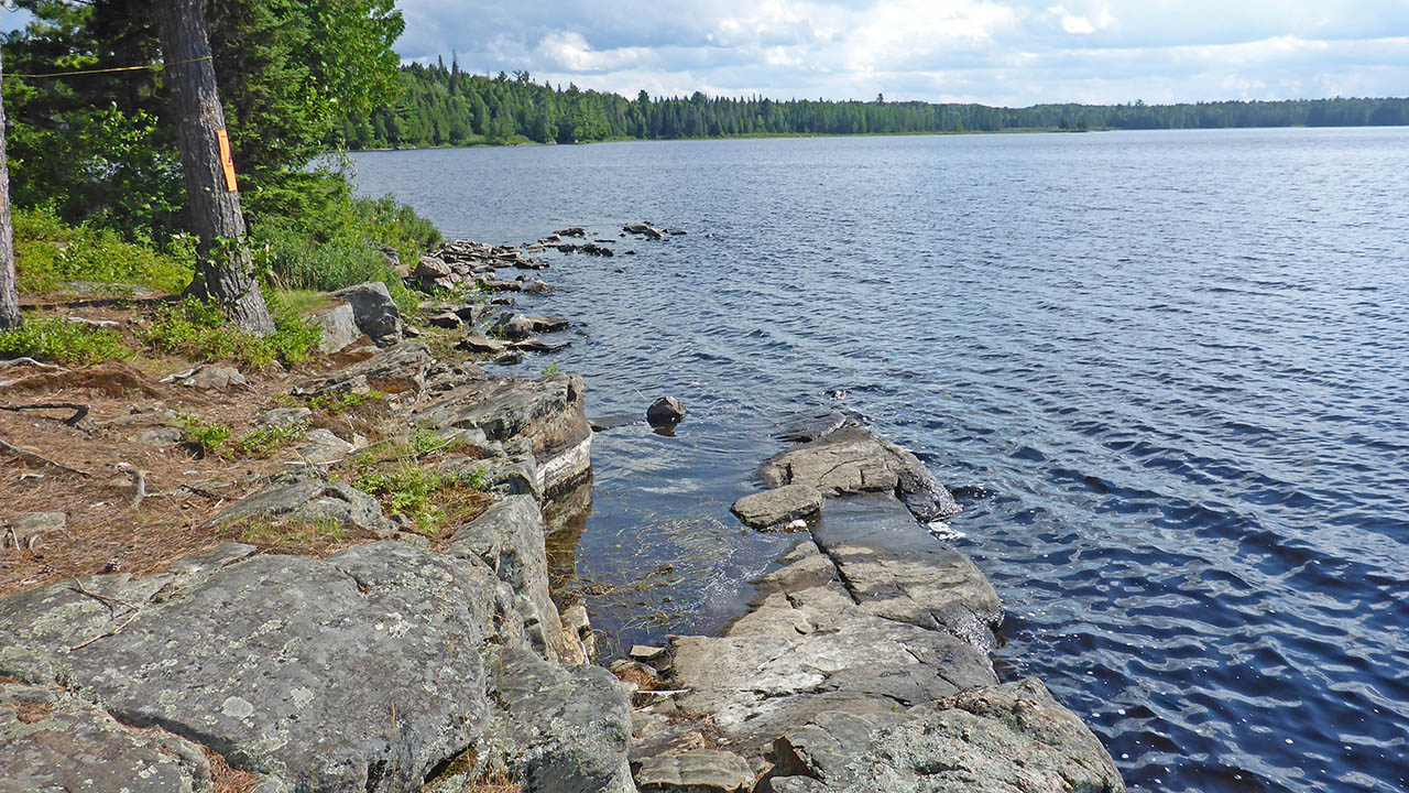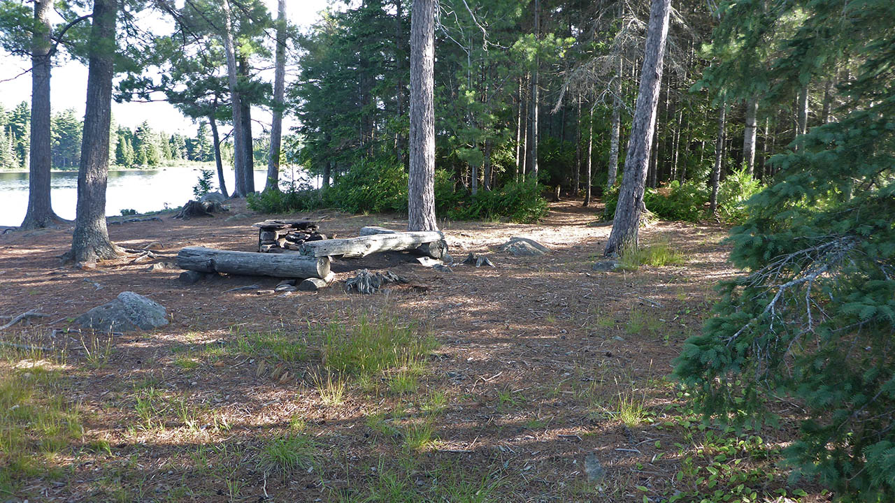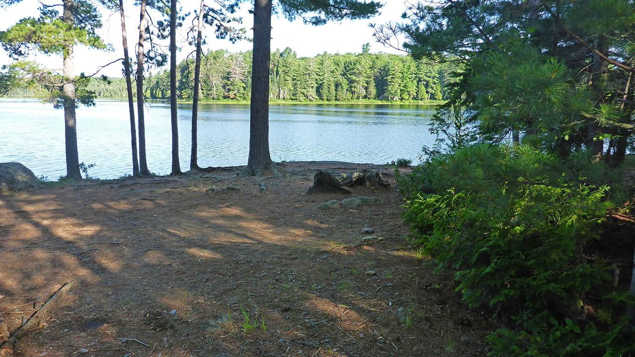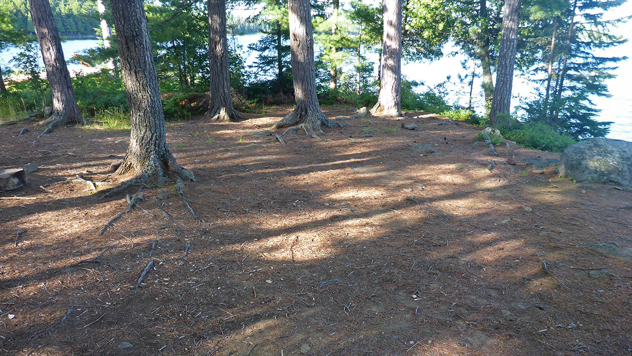 Campsite Regular or low-maintenance: Regular Size of open ground area: 20m x 10m. Extent of tree cover: 30%. Degree of levelness: Level, slopes slightly toward landing at front of site. Number of tent sites: 4+. North exposure: Trees, view of lake. East exposure: Trees, view of bay at back of site. South exposure: Trees, view of lake. West exposure: Open view of lake. General description: Large open site located on a small penninsula. Numerous tenting options as site is generally flat with smooth ground. This site offers no protection from the wind, but is a very sunny site. Overall accessibility: No accessibility issues.