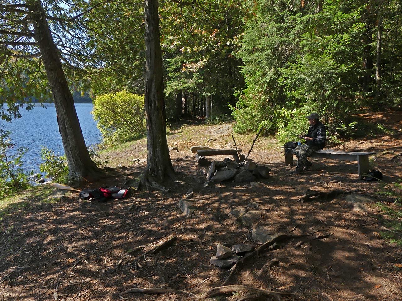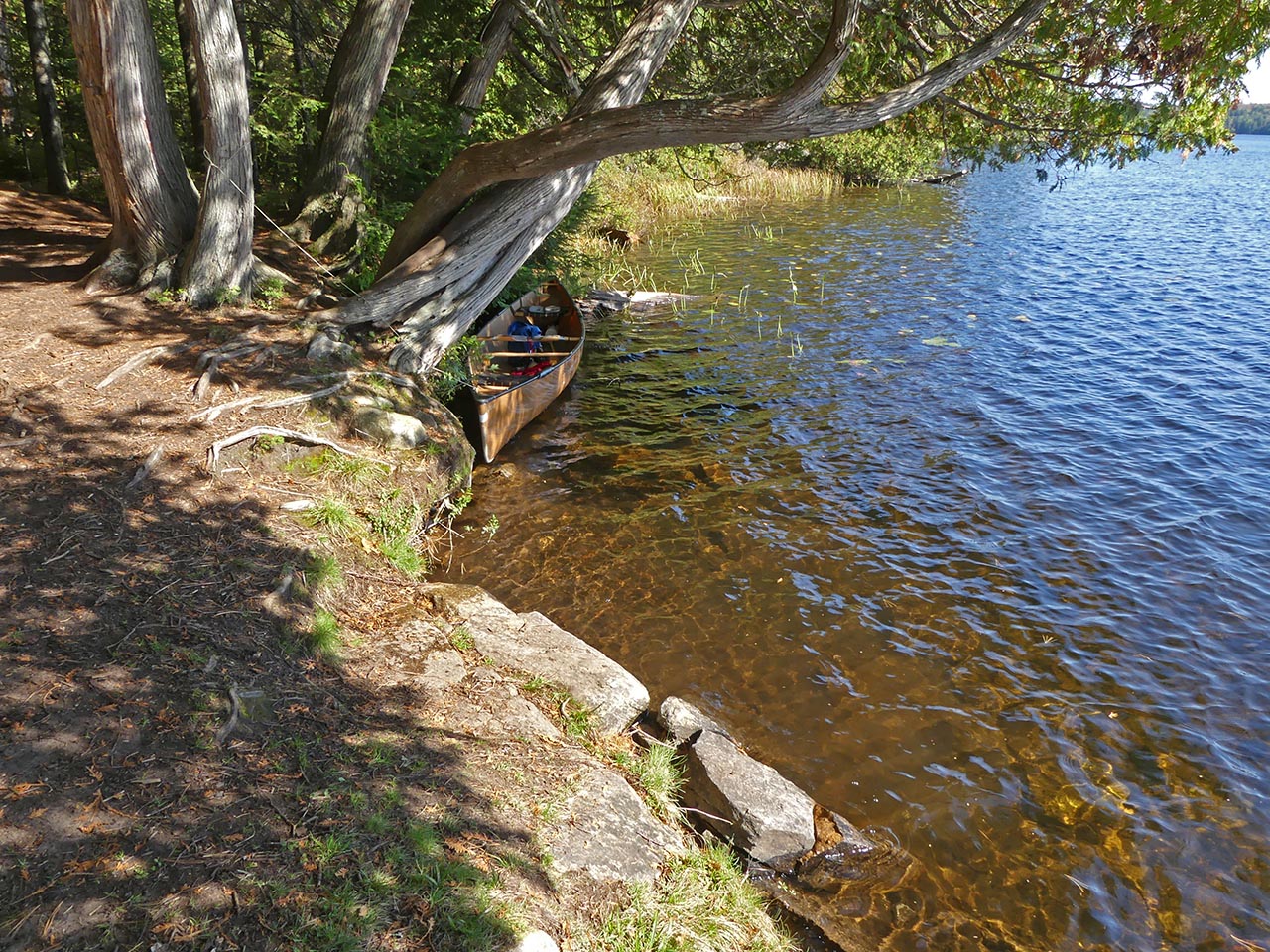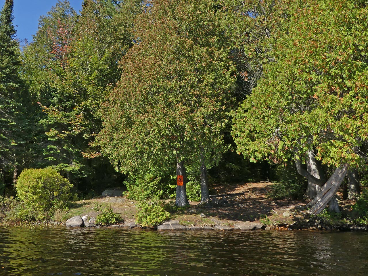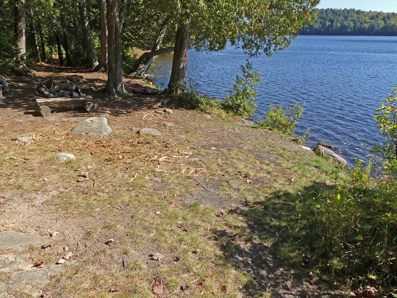 Landing Topography of under-water approach: Rocky section. It requires care. Impediments to disembarking from and/or unloading a canoe: Be prepared to get feet wet. Topography to tent sites: Slight grade up to campsite level. Campsite's clearing, firepit, landing, and tentsites run along the shore's slight rise ... A low ledge of rocks comprise the landing ... Campsite Campsite maintenance: Regular. Size of open area: 20 x 30 feet. Extent of tree cover: 60%. Degree of levelness: Mixed. Number of level tent sites: two small and one medium. North exposure: Trees. East exposure: Trees. South exposure: Lake. West exposure: Trees. A clearing is located alongside the firepit, which is sheltered by a couple of trees ... Possible tentsite for a small tent has a clear view down the lake ... The firepit has a clear view south across the west bay of the lake ... Another possible small tentsite ... This larger area has a definite slope that disqualifies it as a tentsite ... Located toward the rear, this could hold a medium-sized tent ... View across the clearing and the lake ... General description: While it is oriented south with mid-day sun, summer sunsets and bug-clearing winds are blocked by shoreline trees. Given the rocky shore, canoes should be hauled out to avoid wave action. Overall accessibility: Moderate. ![]() Thanks to Jeffrey McMurtrie of Jeff'sMap for supplying the base-layer map component by Creative Commons licensing. Submitted by Barry Bridgeford .. Visited Oct. 2017 .. Submission Oct. 2017 |