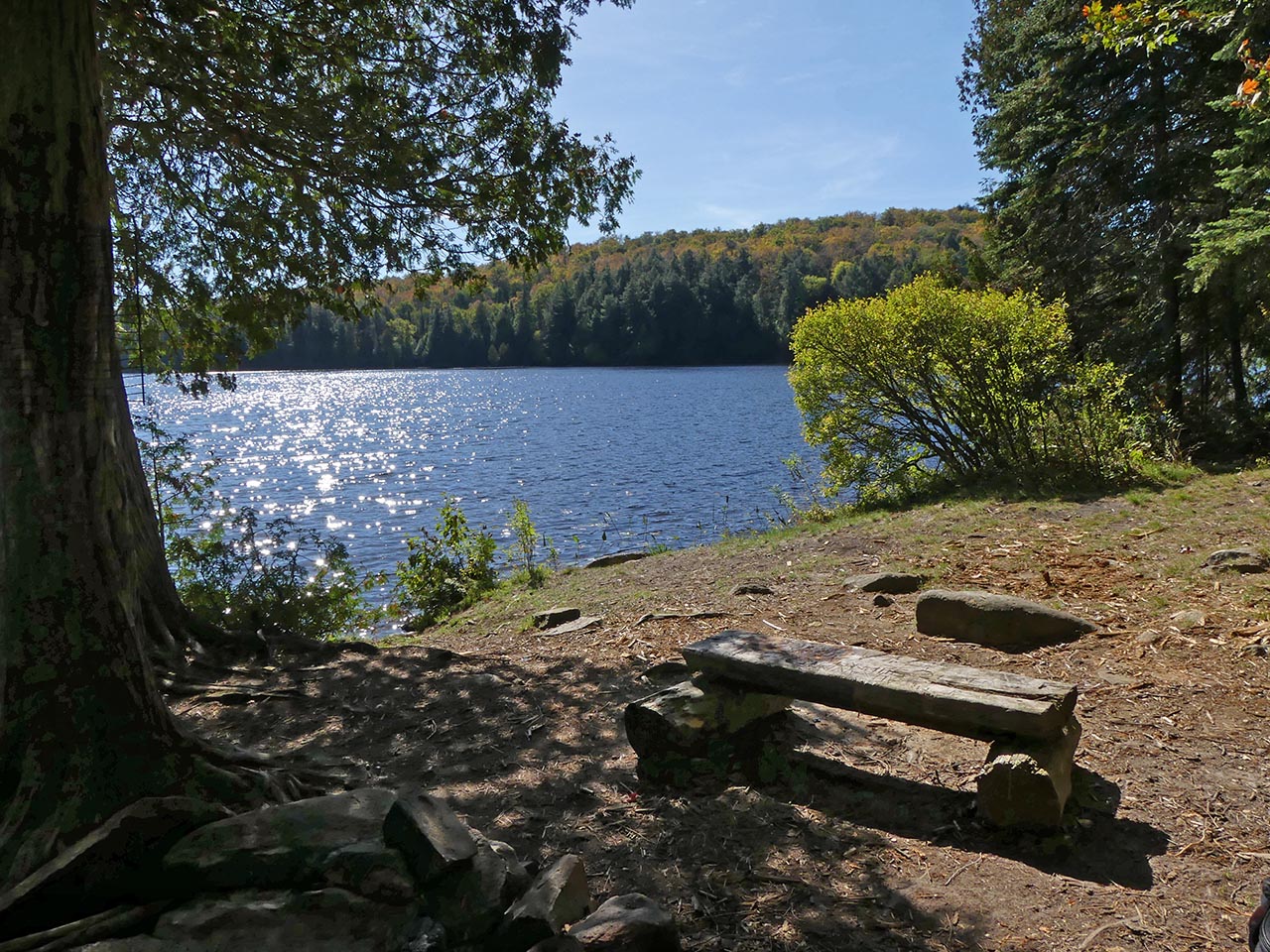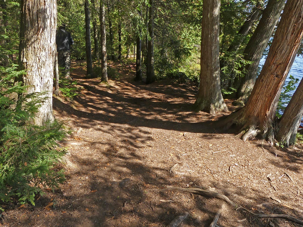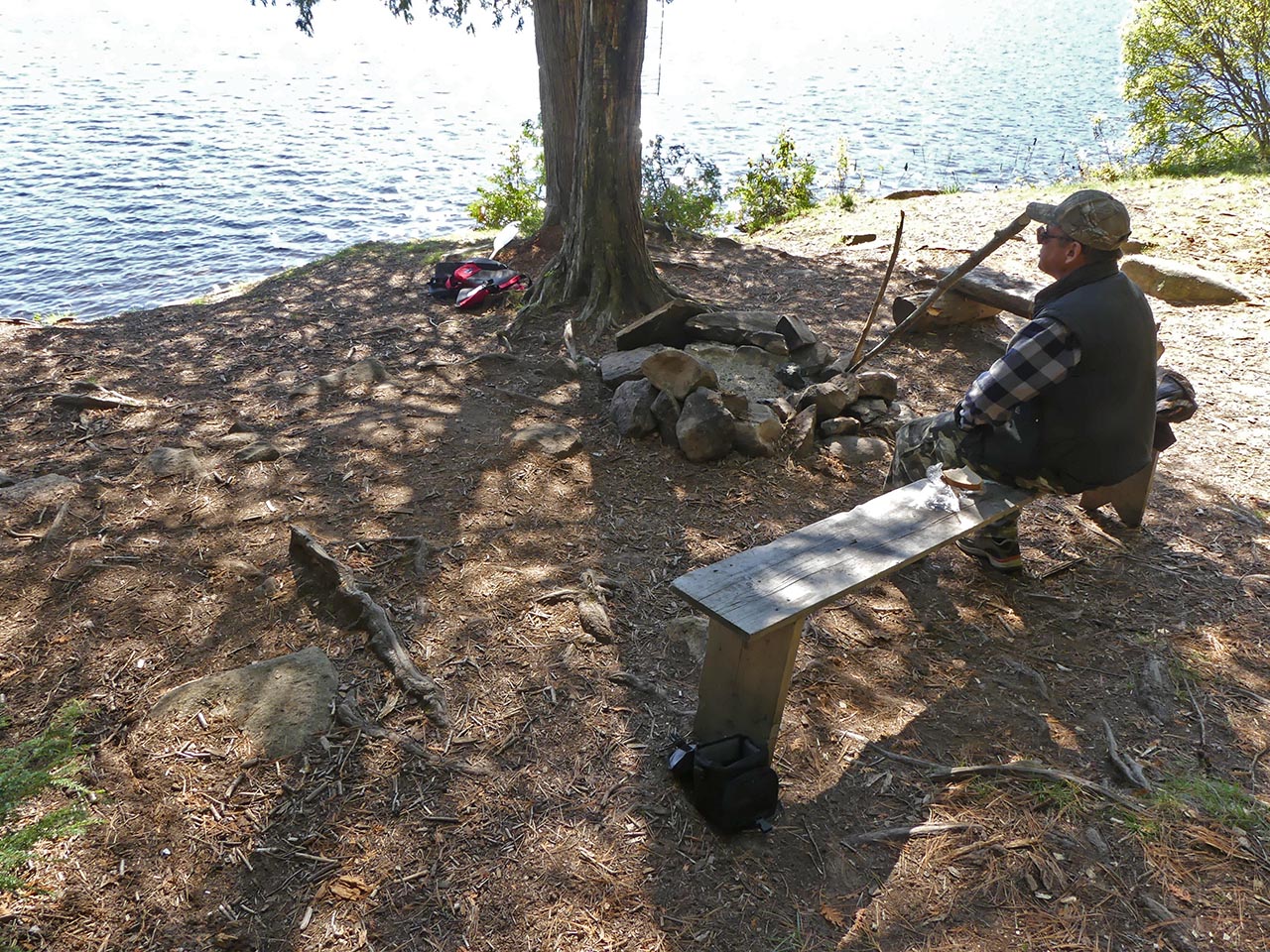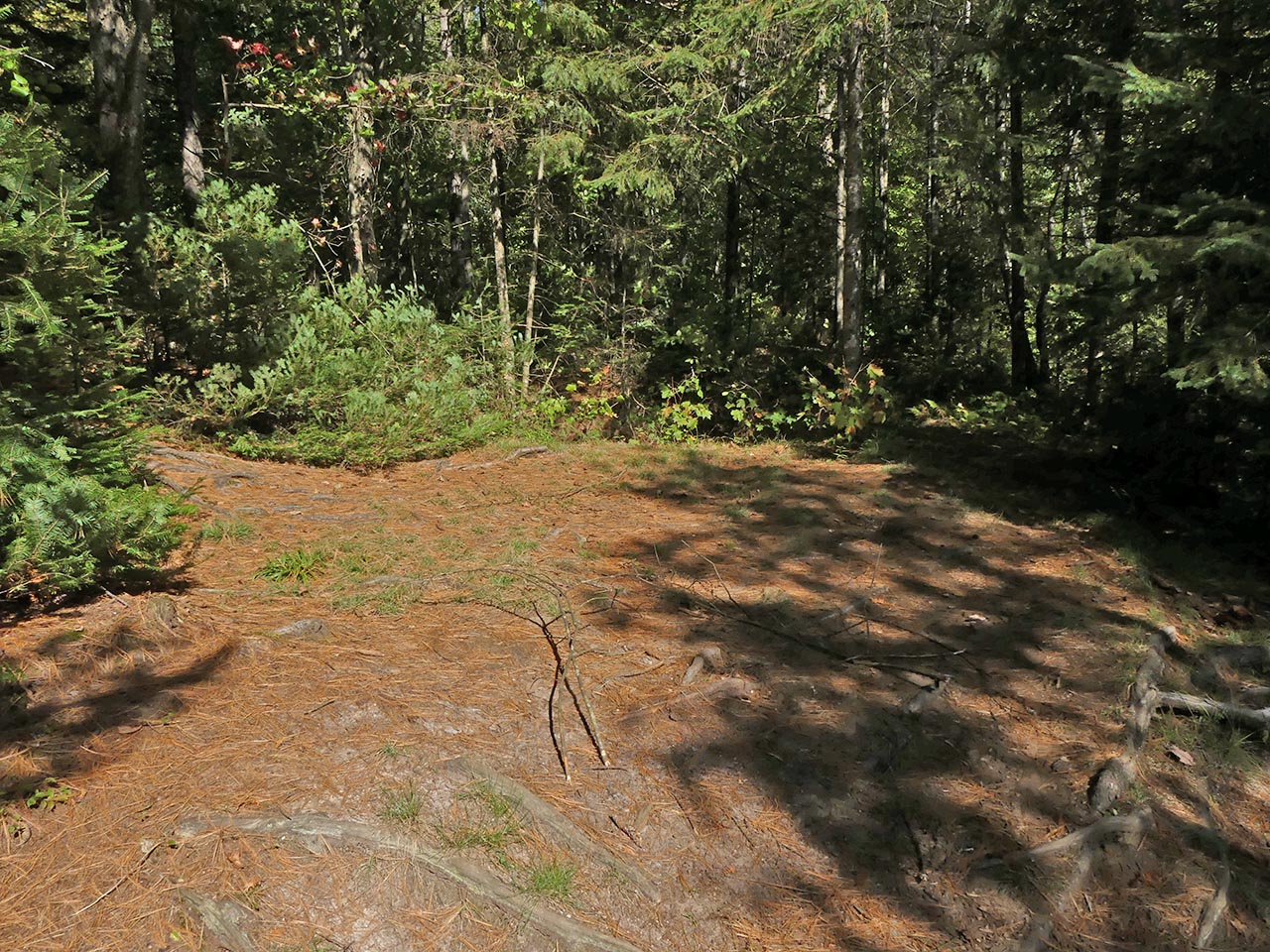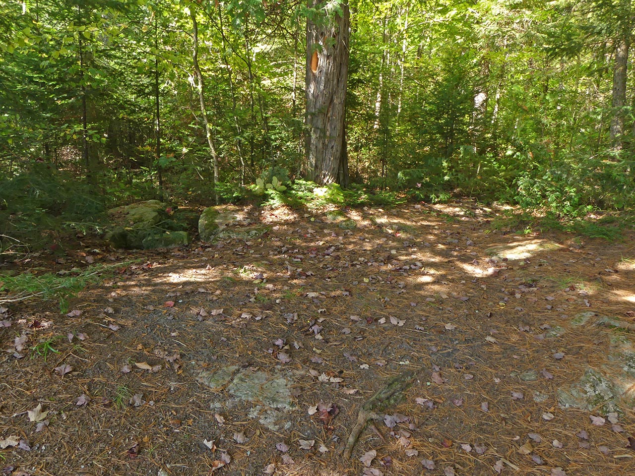 Landing Topography of under-water approach: Rocky section. It requires care. Impediments to disembarking from and/or unloading a canoe: Be prepared to get feet wet. Topography to tent sites: Slight grade up to campsite level. Campsite's clearing, firepit, landing, and tentsites run along the shore's slight rise ... A low ledge of rocks comprise the landing ... Campsite Campsite maintenance: Regular. Size of open area: 20 x 30 feet. Extent of tree cover: 60%. Degree of levelness: Mixed. Number of level tent sites: two small and one medium. North exposure: Trees. East exposure: Trees. South exposure: Lake. West exposure: Trees. A clearing is located alongside the firepit, which is sheltered by a couple of trees ... Possible tentsite for a small tent has a clear view down the lake ... The firepit has a clear view south across the west bay of the lake ... Another possible small tentsite ... This larger area has a definite slope that disqualifies it as a tentsite ... Located toward the rear, this could hold a medium-sized tent ... View across the clearing and the lake ... General description: While it is oriented south with mid-day sun, summer sunsets and bug-clearing winds are blocked by shoreline trees. Given the rocky shore, canoes should be hauled out to avoid wave action. Overall accessibility: Moderate. ![]() Thanks to Jeffrey McMurtrie of Jeff'sMap for supplying the base-layer map component by Creative Commons licensing. Submitted by Barry Bridgeford .. Visited Oct. 2017 .. Submission Oct. 2017 |