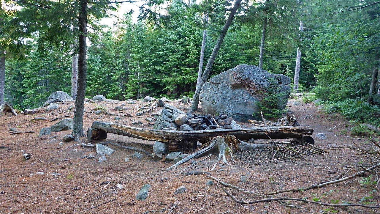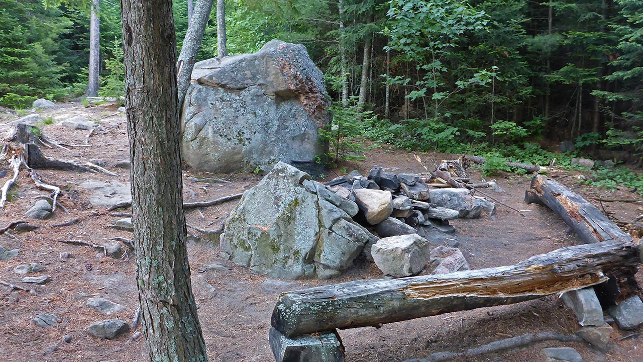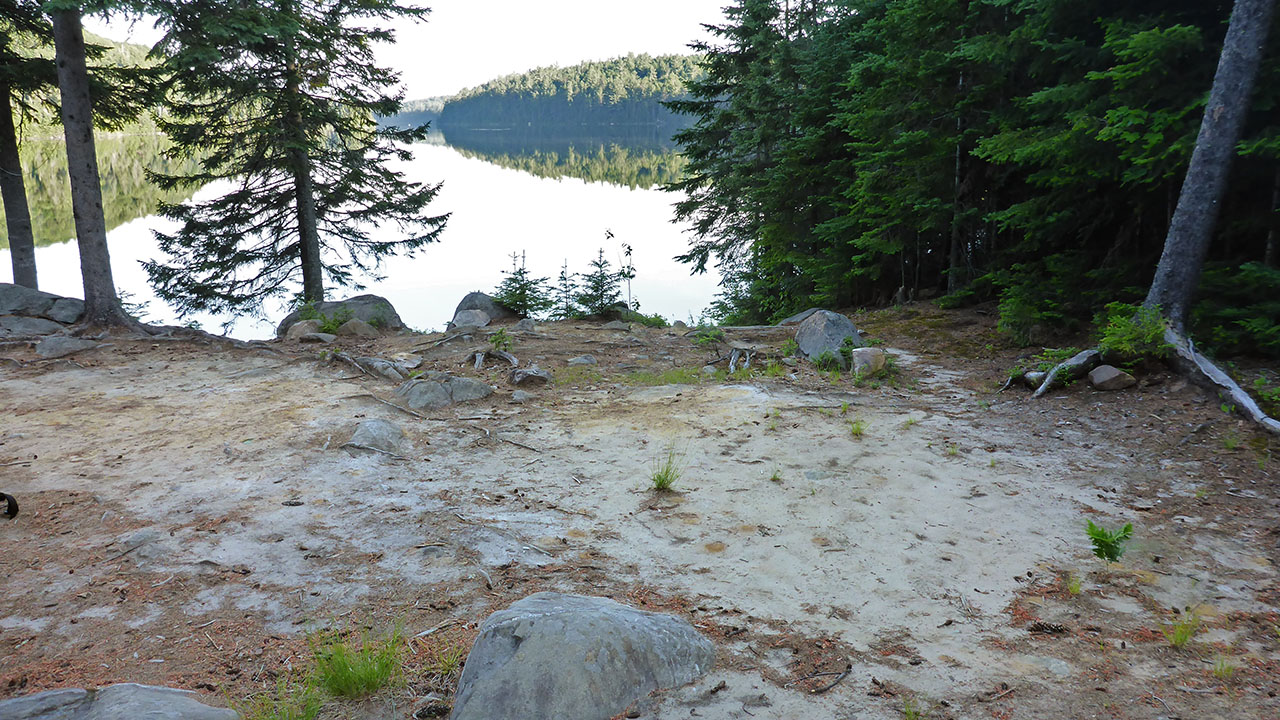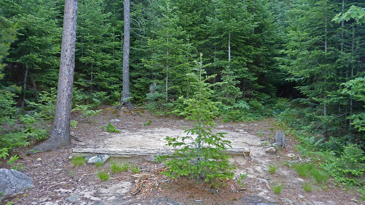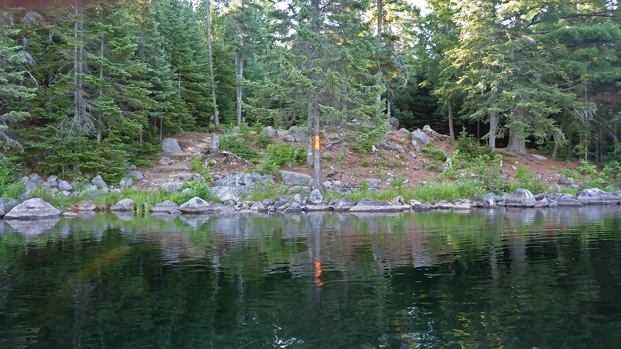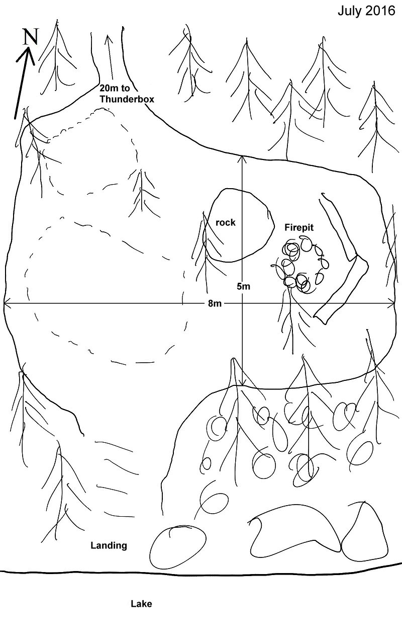 Landing Topography of under-water approach: Shallow water, rock and sand bottom. Impediments to disembarking from and/or unloading a canoe: Some medium size rocks, has area to place gear. Topography to tent sites: A 2m climb up a short tiered path . The landing and tiered path are on the left ... Campsite Campsite maintenance: Regular. Size of open area: 8m x 5m. Extent of tree cover: 40% (all on the firepit side of site). Degree of levelness: Tenting area is quite flat. Firepit side of site has a slight slope. Number of level tent sites: 3. North exposure: Trees. East exposure: Trees. South exposure: Trees. West exposure: open view of lake. General description: A small site that is sloped, but with 3 flat sandy tentpads. A large boulder separates the firepit from the tenting area. The open view of the lake gives a good view of the setting sun. Overall accessibility: No real issues, as the tiered path to the site is not a severe climb. of the slope of the site and the path behind the boulder ... The smaller tentpad and the path to the thunderbox ... A couple of rocks divide the tentpads ... ![]() Thanks to Jeffrey McMurtrie of Jeff'sMap for supplying the base-layer map component by Creative Commons licensing. Submitted by Chris Taylor .. Visited July 2016 .. Submission September, 2016 |