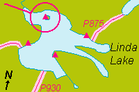 5. Grade: Now and then, you'll wonder why a campsite was located where it is ... on the side of a hill! Photo: This is the only campsite on Little Rock Lake. It has a small "shelf" on a steep slope high above the water. With its tiny tentsite cut into the hillside, one actually wonders about stumbling in the dark and rolling into the lake. Unless it's the only choice, seriously consider looking for a better campsite. |