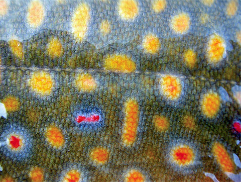 D - Moderately forked tail. Yellowish spots on flanks usually extended onto belly. No red spots, but sometimes orange spots; rarely blue halos. red-orange fins with black/white leading edges.