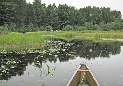"Uppa", of "KayakCamper.com", has shared the trip-log of his early spring of last year 4-day solo loop out of the North River access point, east by the North River, circling back through Allan, Menona, Big George and Wabamimi Lakes, to North River Lake. His trip-log is in the form of a forum posting ... Bushwhacking in Algonquin - with a Sea Kayak. "As I reached the edge of Wabamimi I started to get nervous: the forest between me and the lake was extremely dense: the only way I'd be getting a boat through there would be with a chainsaw and a few days of felling trees. So I kept walking the road, hoping for a change of fortune. As I reached the point where the logging road would start getting further and further away from the lake with every step I took, the forest finally started to look manageable: barely." |