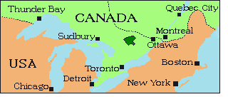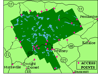 Algonquin Park is located midway between Sudbury and Montreal, Canada. It's southern section is bisected by Highway 60. This section can be reached by an automobile drive of approximately 3 hours north from Toronto, by way of Highways 400, 11 and 60 (through Huntsville). It can also be reached by an automobile drive of approximately 3 hours west from Ottawa, by way of Highways 417, 17 and 60 (through Killaloe). |