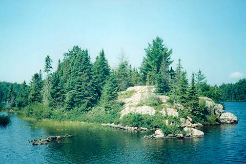 Northeast IslandThis is one of the smaller islands at the northeast end of Sunbeam Lake. It's one island west of a smaller one that you can see to the northwest as you paddle out from the portage from Tree Frog Lake to Sunbeam. This island has a campsite on it. The rounded rock to the far right of the island has a steep drop-off under the water and is a great place for swimming. There were a quite a few well sized fish living in the crags, but they wouldn't be caught. Camera: Minolta Vectis GX-4 (APS) ... a waterproof camera which is perfect for wilderness trips.