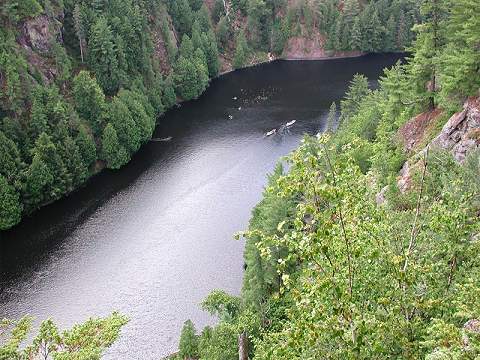Heading Upstream Barron Canyon, July 2001. Two upstream-bound canoes head around a bend, disappearing up the canyon. The view is from the Barron Canyon Trail. Camera was a Nikon Coolpix 990 digital.