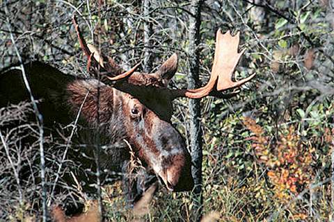 In Camouflage This bull moose was located by the road to Opeongo Lake, in the fall of 1999. Taken with a Canon F1n, 300mm f/2.8 Tamron lens and a 1.4x extender. Film: Fuji Sensia 100.