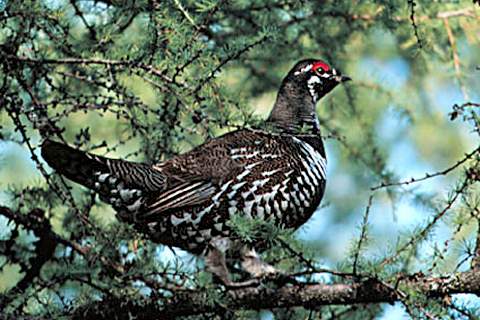 Bird In A Tree Male spruce grouse .. taken alongside the road to Opeongo Lake in the fall of 2001. Taken with a Canon EOS 1v, 70-200mm f/2.8 lens, 2x extender and a 555ex Canon Flash w/Flash-x-tender Film: Fuji Sensia 100.