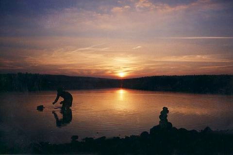 Fading Fast My husband was out gathering water. Our site here on Booth Lake was perfect for sunsets .. the second site from the trail to Chipmunk Lake. As you can see, our past-time was building up the rocks on the beach.