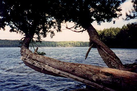 Sentinel Cedars After setting up camp on Sept 11 on a westerly site on Three Mile Lake, across from the N. Sylvia portage, I was standing on the shorline at our campsite looking down the lake. I noticed a patch of sun momentarily protrude out between two clouds and cast itself upon the forest. Working quickly and looking around for an ideal composition, I chose the space between two leaning cedar trees. 35 mm Kodak 400 Max Image film.