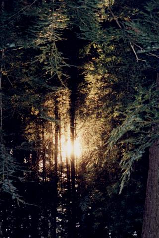 Through the Forest On Sept 11, as the sun was about to set on Three Mile Lake, I walked westward through the woods from our campsite. Suddenly, I saw the sun's rays glistening through the spiralling pines trees. Using a tall pine to split and shield the direct glare of the sun's rays, I suddenly had a blending glow of light among the trees. 35 mm Kodak 400 Max Image film.