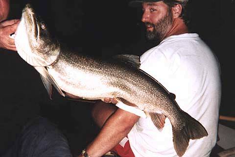 Monster Lake Trout 20 pound, 40 inch Lake Trout caught & released in a secret lake in Algonquin Park - August 2nd / 2001 by Dean Robinson of Carlisle, Ontario. Caught on a light action rod, 6 pound test line while trolling 40 feet deep using a 3-way swivel system out of a canoe. Guide and fishing coach was Gary Skrzek of Waterdown, Ontario. Filmed on a cheap disposable camera