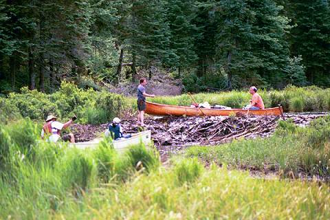 Another Larger Dam This dam was on the Tim River upstream of Little Butt Lake. It was most impressive and I managed to sink up to my knees in rather smelly mud lifting the canoe over it. By the time three canoes had passed over it, the top of the dam was significantly leaking but by the time we returned 2 days later the dam was repaired and about a foot higher than before. This reduced water levels between the dam and Rosebary Lake. On the return journey we found ourselves frequently grounded on the mud in the slow section. If you jumped out in this section, you'd sink in the river bed at least to your waist and the water is full of leaches! On the return trip (just before we got to Tim) we met a park ranger who pointed out that they used to go out and dynamite the dams on this section of the river. They gave up in the end because with in 2 weeks the dams were always as high as before !!! Clever little tinkers eh? We didn't manage to see beaver (great shame) but there was plenty of evidence with lots of lodges and numerous dams of various sizes. Camera was a Pentax P30T with a Tamron 80/210mm lens.