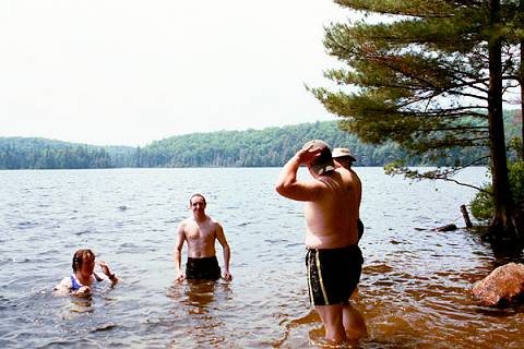 Swimming in Tim Lake This is at the camp site on the west side of the island. We hadn't seen any leeches at this point in the trip. A group of six of us went on a four day trip from the Tim River access point. We camped on night 1 at Tim Lake, with nights 2 and 3 on Rosebary Lake. All contacts were established by internet groups before the trip. I had met none of the group until the trip. Brian (closest to camera) and Steve (facing camera) knew each other and Brad (behind Brian) and Grace were a couple before hand, otherwise we were strangers. That's me (Carol) dipped down in the water. I have to say we had a brilliant trip. A big thumbs up for the internet and email (despite my mother thinking I was going to meet a bunch of psychopaths). Camera was a Pentax P30T with a Tamron 80/210mm lens.