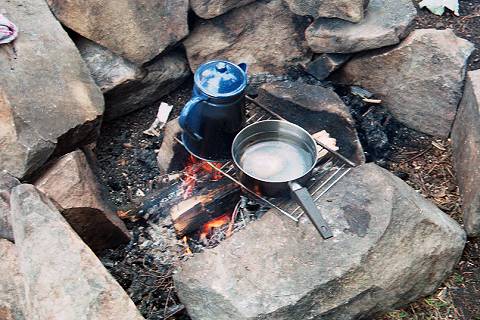 12. Wood Fire Cooking Carry a small grill ... enough for a pair of pots. Scoop out the ashes from the fire pit. Make a combination windbreak and grill support from rocks. Stockpile kindling and firewood. Dry them out on windswept rocks. Then, keep them dry under your tarp. You don't need a raging inferno. A small bed of coals, regularly fed with dead branch pieces, will require less effort. |