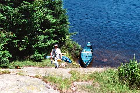 3. First Night's SiteOnce over the portage and past the old railway bridge, we paddled east around the island. Here Scott brings supplies up to our site high on the island's southeast point.