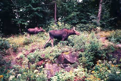 As moose feed on tender plants and drink salty water alongside the highway, they provide motorists with the chance to stop and watch them from closeby. It's wise to not walk close to males or females with young. |
