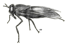 They're knowned for circling around one's head during canoeing, hiking and swimming ... prior to zeroeing for the bite. On sunny but windy days, deer flies annoy canoeists by staying in the sheltered area below the gunnels and biting at their shins and feet. | ||