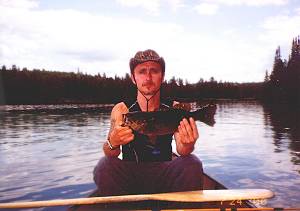 Back at camp I fillet the keeper and find it has some sort of parasite .. small yellow worms in the meat. Never saw that before, so I toss it and make chicken patties and rice. We clean up camp, filter water for our canteens and eat space ice cream. Then we hoist our food pack up a tree and turn in around 9:30pm. Loons are singing and I hope we sleep through the bears.7/25/00 A restless night. Tom jr. snores like a grizzley bear. Lots of animal noises. Up at 5:30am.